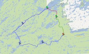 We’ll be starting off at Tuscarora Lodge – of course.  After a night in a bunk house, and availing ourselves of a hot and plentiful French Toast breakfast, we will begin our trip.  Carl has arranged for us to get a tow to our starting point.  So first we get a ride to Saganaga Lake (the green line), then they tow us in with our canoe to a remote staring point (the red line) – cool, I’ve never done that before!  From there, we will spend four days canoeing back to Tuscarora on Round Lake (the blue line).  I haven’t delved into the details too much (I’ve been a bit distracted with that little bike ride we did) but I’m sure it is an aggressive route.  Carl wouldn’t want to do it any other way, and I’m game.