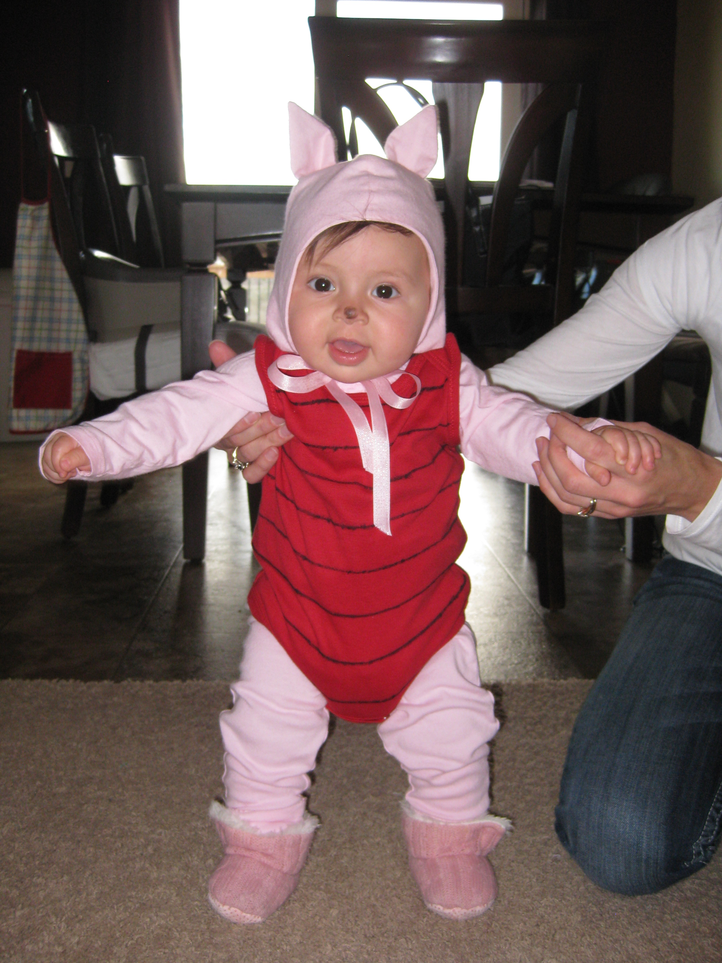 Piglet was a joint effort. Karen sought out the pink leggings and shirt, while I adapted a red onesie for Piglet’s body. All that we lacked was the head and ears. In step the internet. With a quick search I was able to find a free downloadable pattern for an adorable cap. Unfortunately, when finished it turned out to be too small. No problem, using SnagIt (one of my favorite software tools), I was able to save the pattern as an image, expand it and reprint the larger size. The second attempt was a perfect fit! Ears for both Pooh and Piglet were one part sewing experience and two parts imagination.