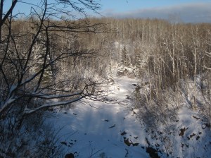sending long shadows across the trail. The sky was a brilliant blue, providing a beautiful canopy over the snowy scene. And the sunshine felt good on my back. Lester River was gurgling under the snow and ice and provided a nice vista as I worked my way uphill.
