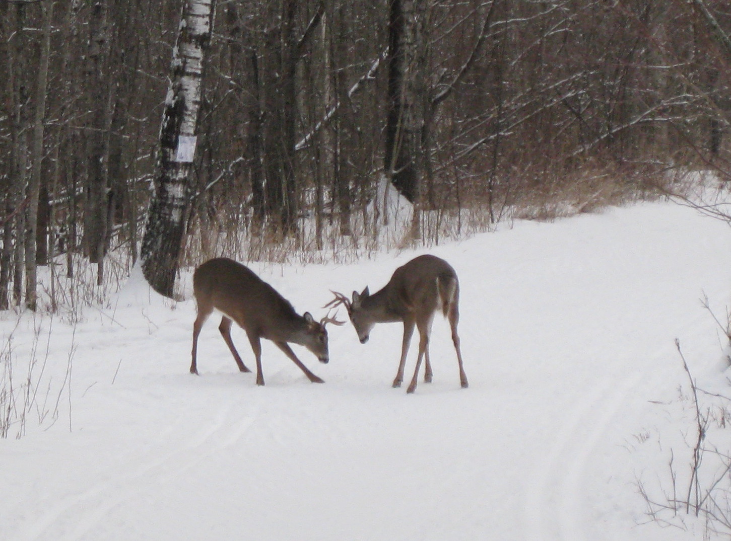 We are fortunate to live right across the street from some nice ski trails embedded in the woods. I was about 2/3 of the way around my first circuit when I spotted two deer standing on the trail a little ways in front of me.  That wasn’t so unusual, but I got my camera out anyway.  It was only then that I noticed their antlers.  And when they began to tangle with each other right in front of me, I knew I had something unique.  I enjoyed watching them sparring and playing in close proximity.