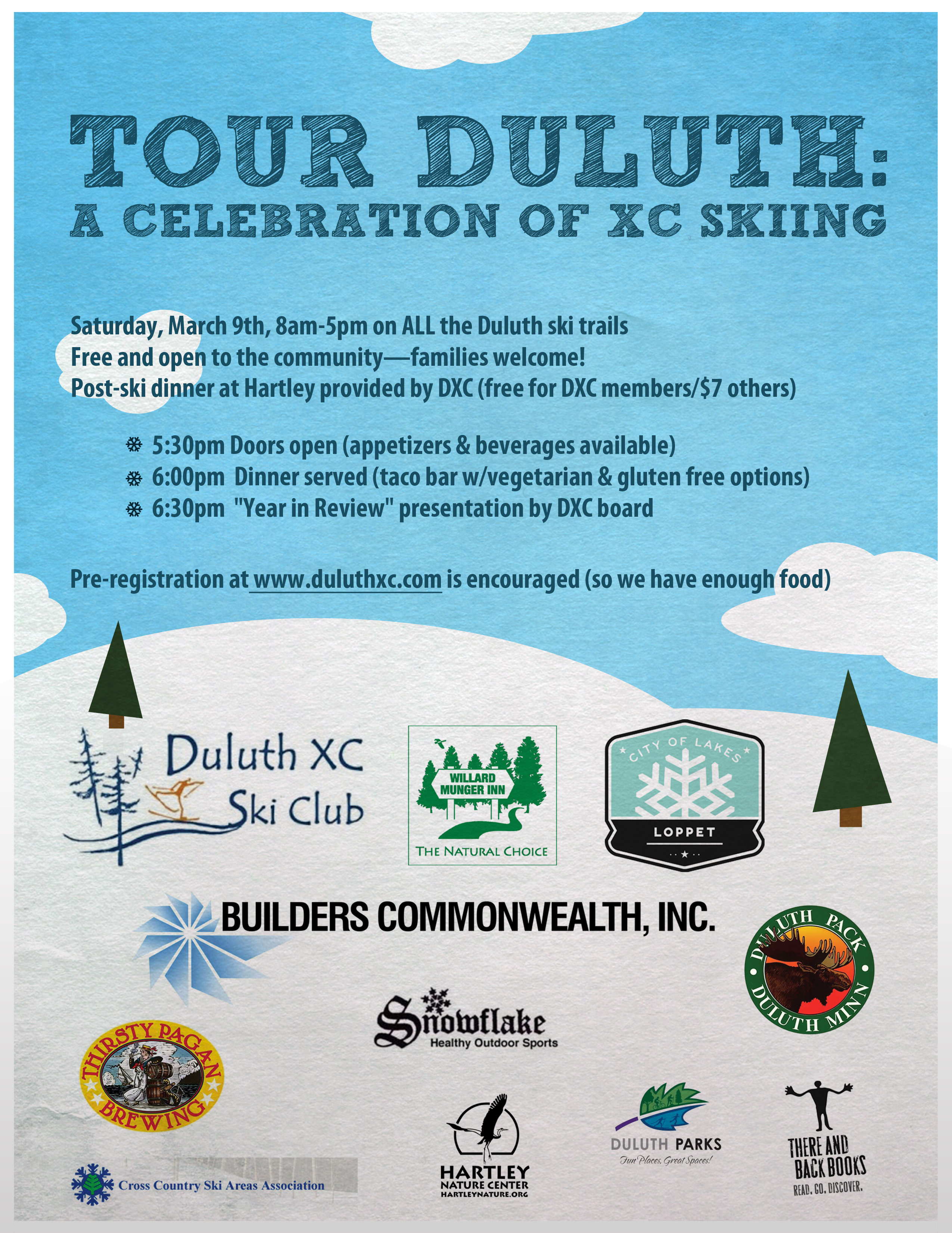 It’s an annual event. Hosted by the Duluth XC Ski Club, the idea is to ski all the trails in the city – in one day. We loved the idea, but Old Man Winter hasn’t cooperated to keep the snow long enough in recent years. This year that was hardly a problem. In what seems to be a recurring theme for us, we skied the Tour pelted by heavy snowfall, wintry mix and rapidly accumulating wet snow. And loved it.