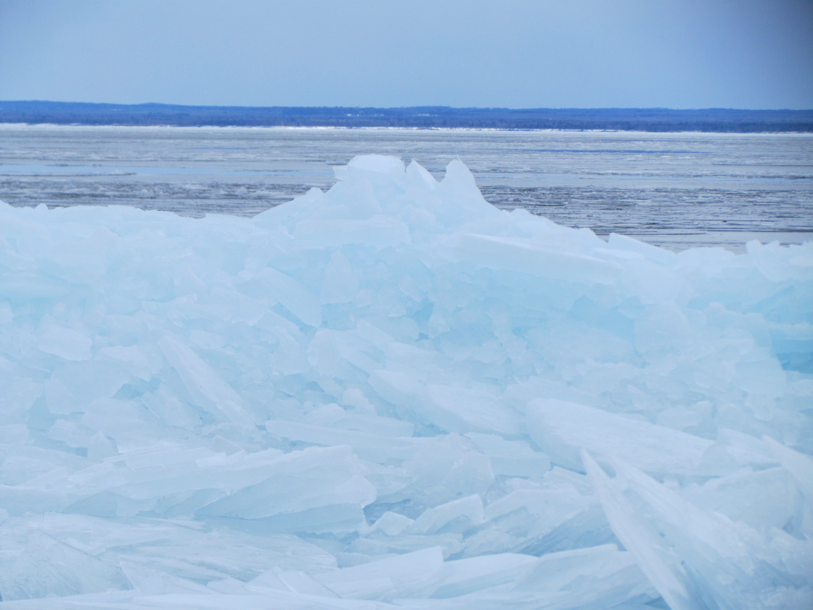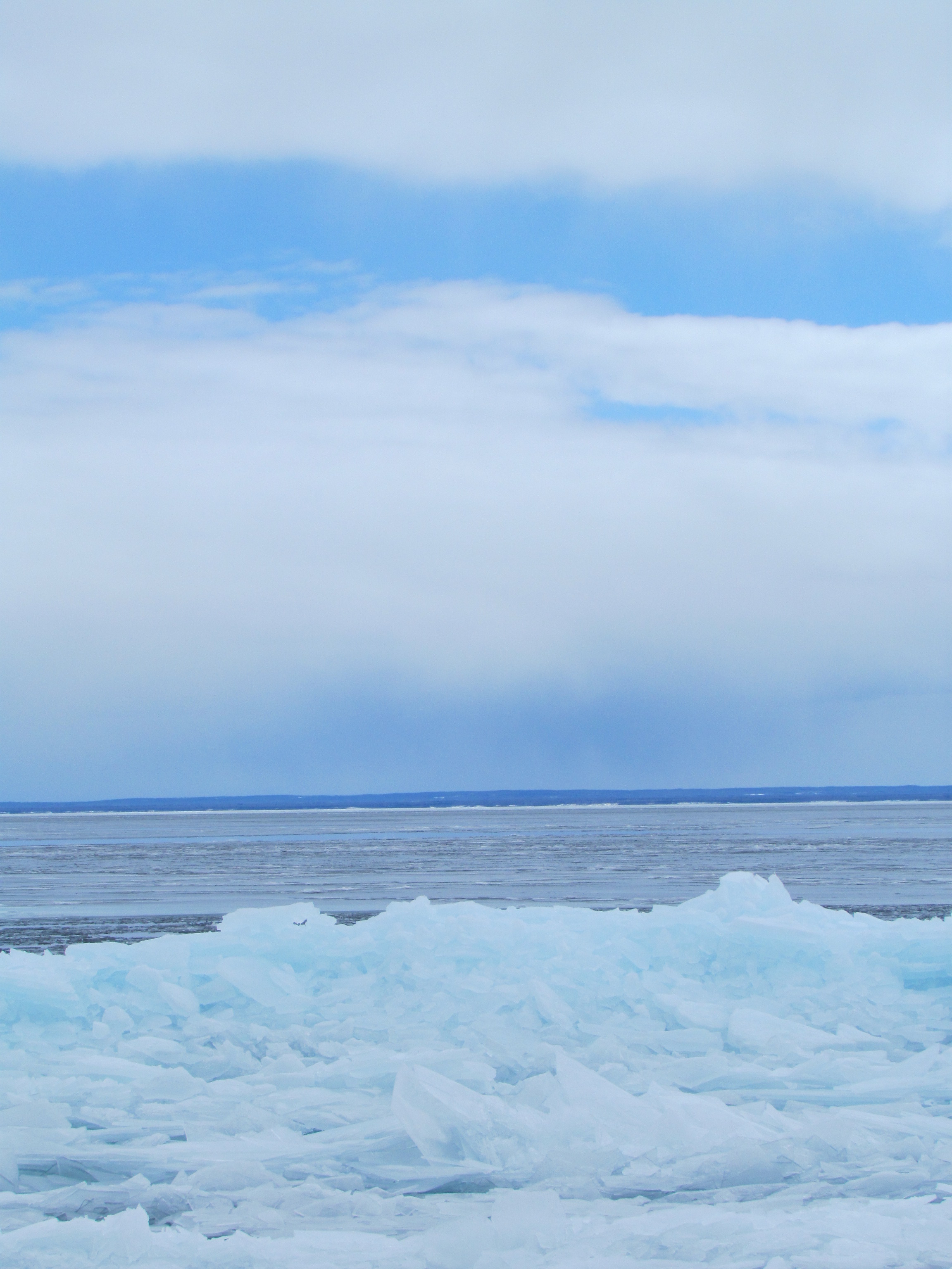 The color was subtle but it was there – blue ice. Out on the perimeter of the hard packed ice and snow, the lake ice had been pushed up to form an ice bank. Thin sheets of recently formed ice were piled in haphazard formations. There wasn’t anything too exceptional about them, except the color. It was distinctly blue, bordering on aqua. In the dreary light of the afternoon, it was as good as I was going to get for photo interest.