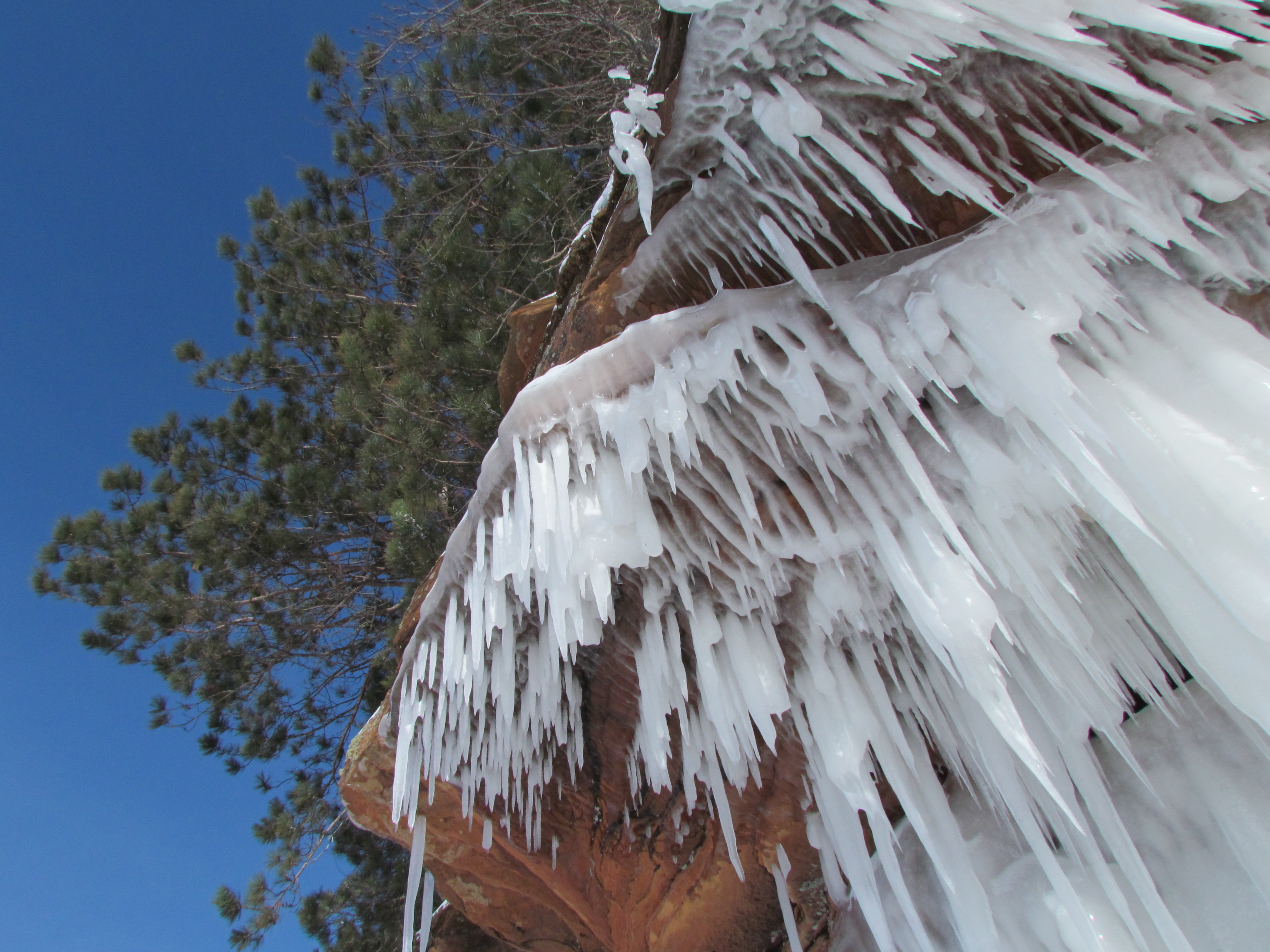 There was no need for snowshoes or ski poles, nor any possibility of getting lost, as the trail was well trampled by many before us. We followed the edge of the lake for about a mile, with the scenery improving with each step. Layers of rock, topped with trees high above our heads became increasingly impressive, as did the spiky icicles that flowed down the exposed edges.