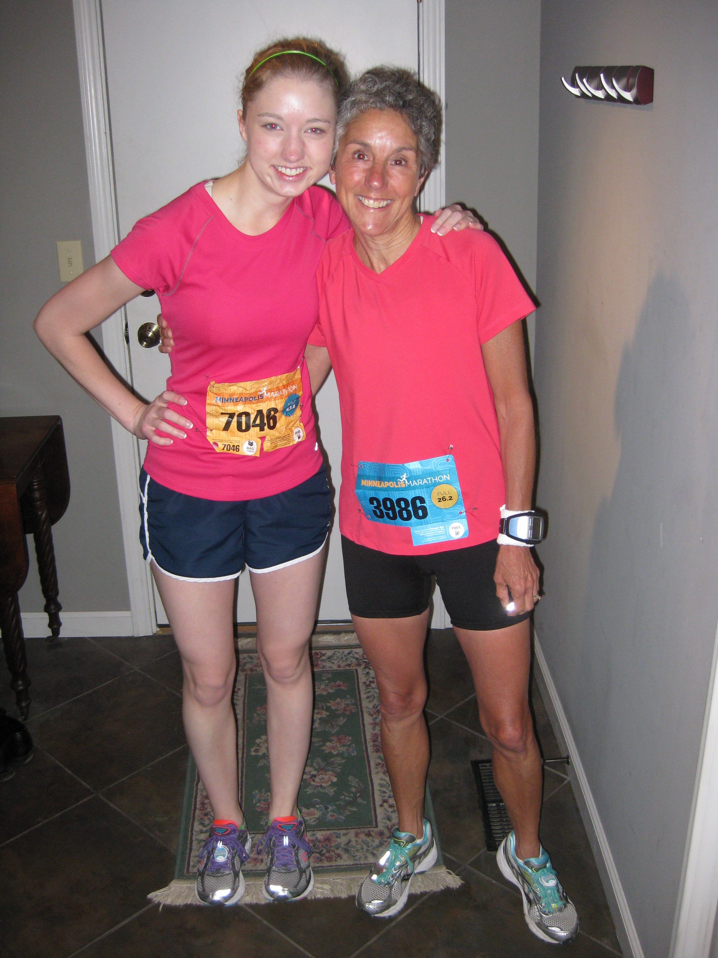 We had a trusty support crew to cheer us on.  My son Erik (Katie is his girlfriend), and Katie’s mom had devised a plan to cover the Minneapolis Marathon course with their two cars.  If the rain cleared, Rich planned to follow us on his bike.  We were all set to go.