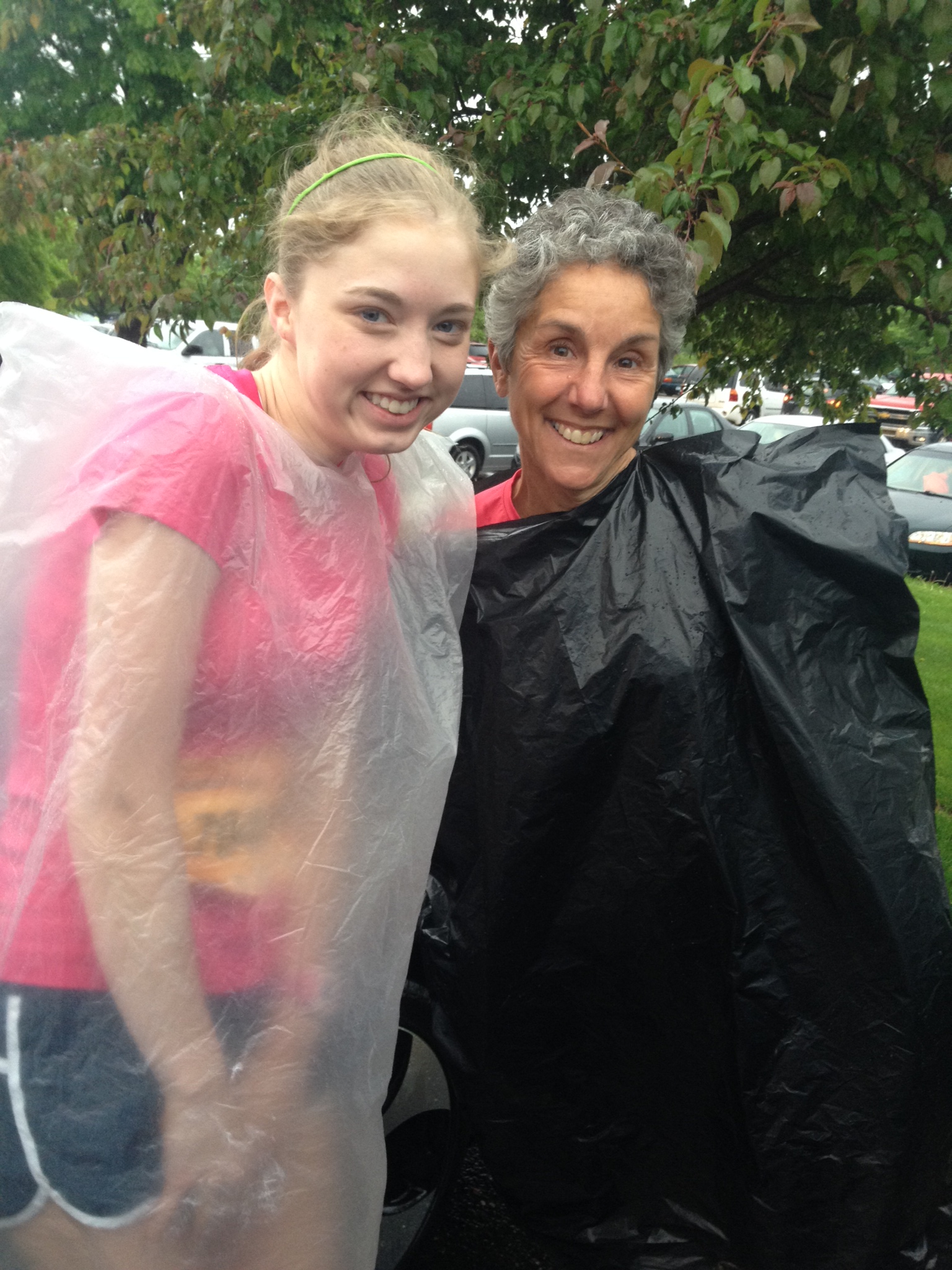 IMG_0894Despite the dark skies last evening and pouring rain, we were hopeful.  Even though the thunder boomed throughout the night, we stayed positive.  Driving to the start in rain and moderate thunder, we still planned to race.  We knew we were going to get wet – really wet – that was a given.  But still we were excited.  This was Katie’s first half-marathon and we planned to run together for that distance, then I’d continue for the full marathon.