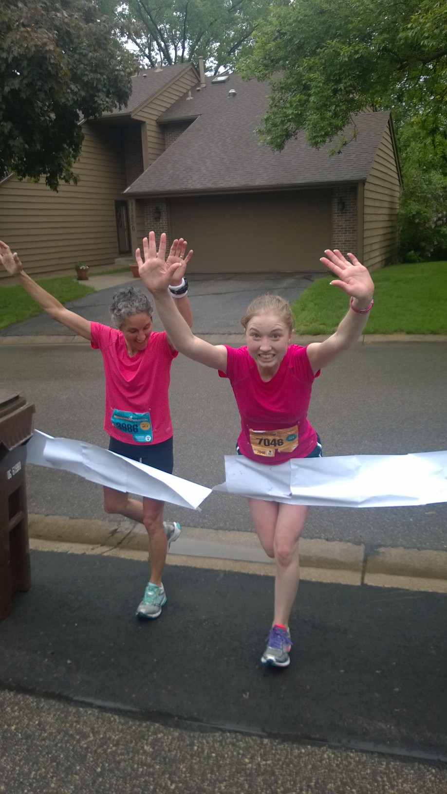 WP_20140601_003With plenty of pent up energy, Katie and I decided we would run home. Sprinting away from the race venue it felt good to be pounding the pavement and doing something after all the time we’d spent waiting.  We pressed our speed, going faster than either of us has run all spring, pouring a marathon’s worth of miles into a shorter, faster distance.  Erik proved to be a trusty cheerleader, meeting us at points along the way with offers of water and Clifbloks for our “race!”  And we crossed the finish line at home, breaking the tape he’d constructed at the end  of the driveway.
