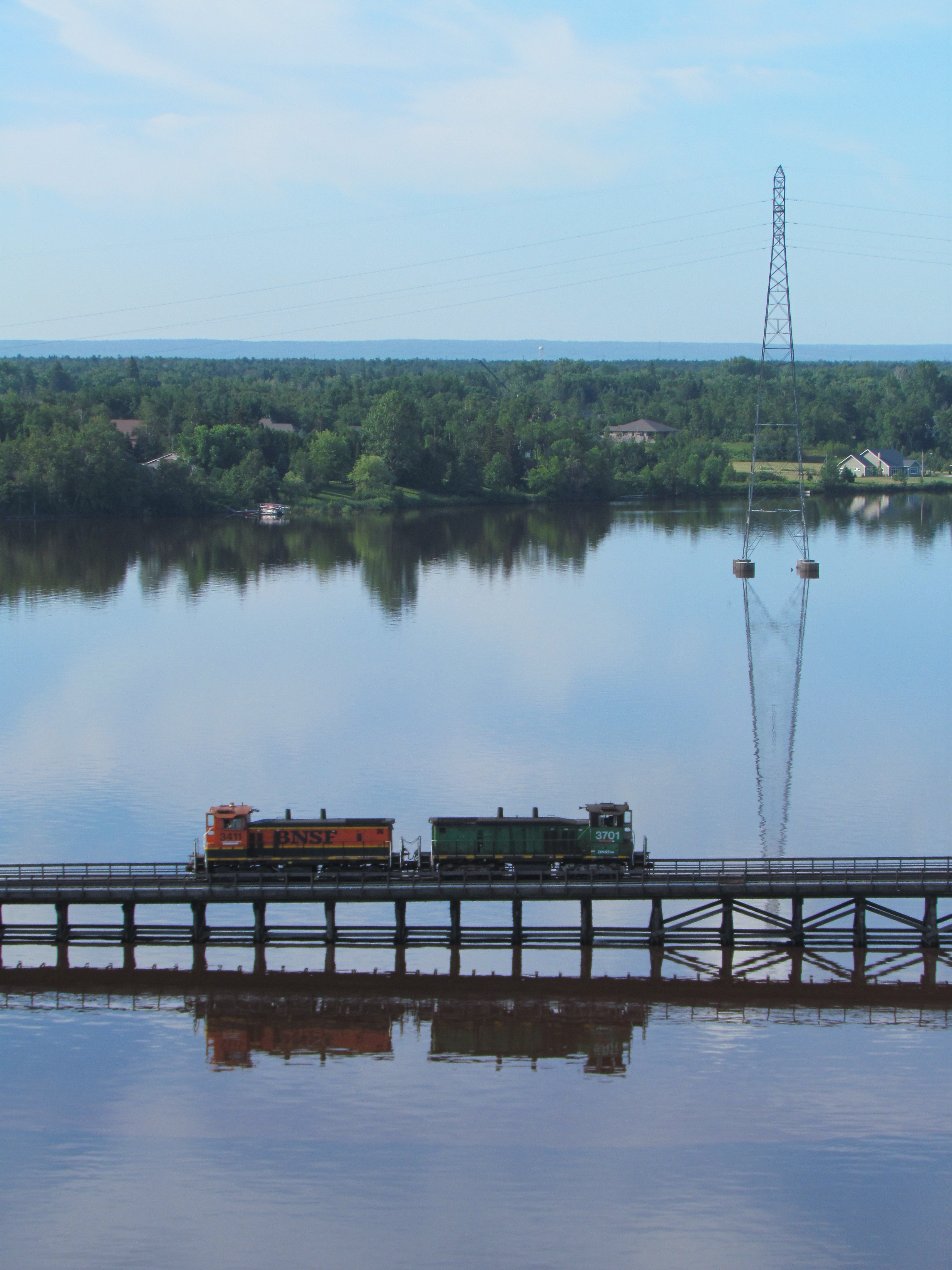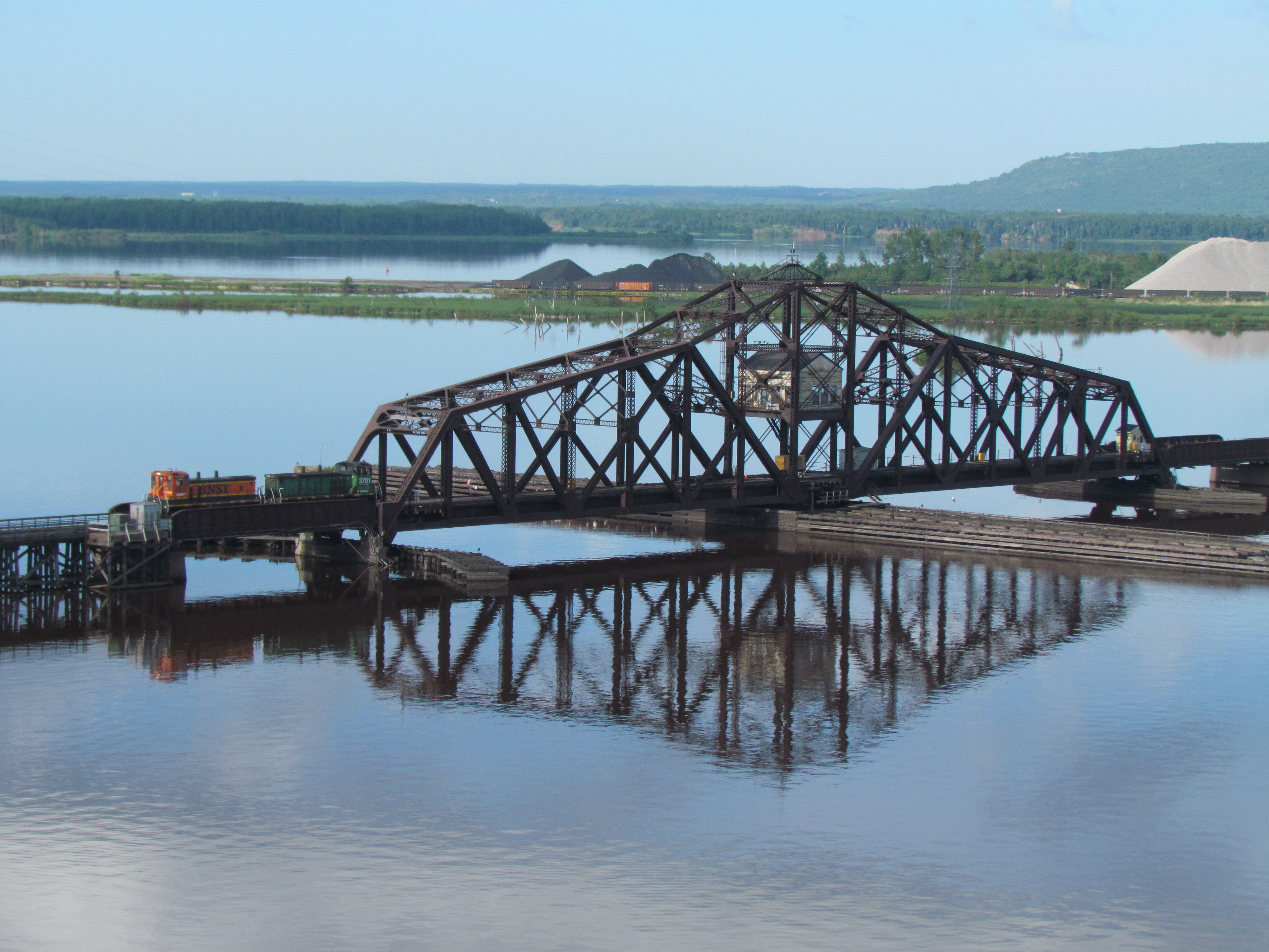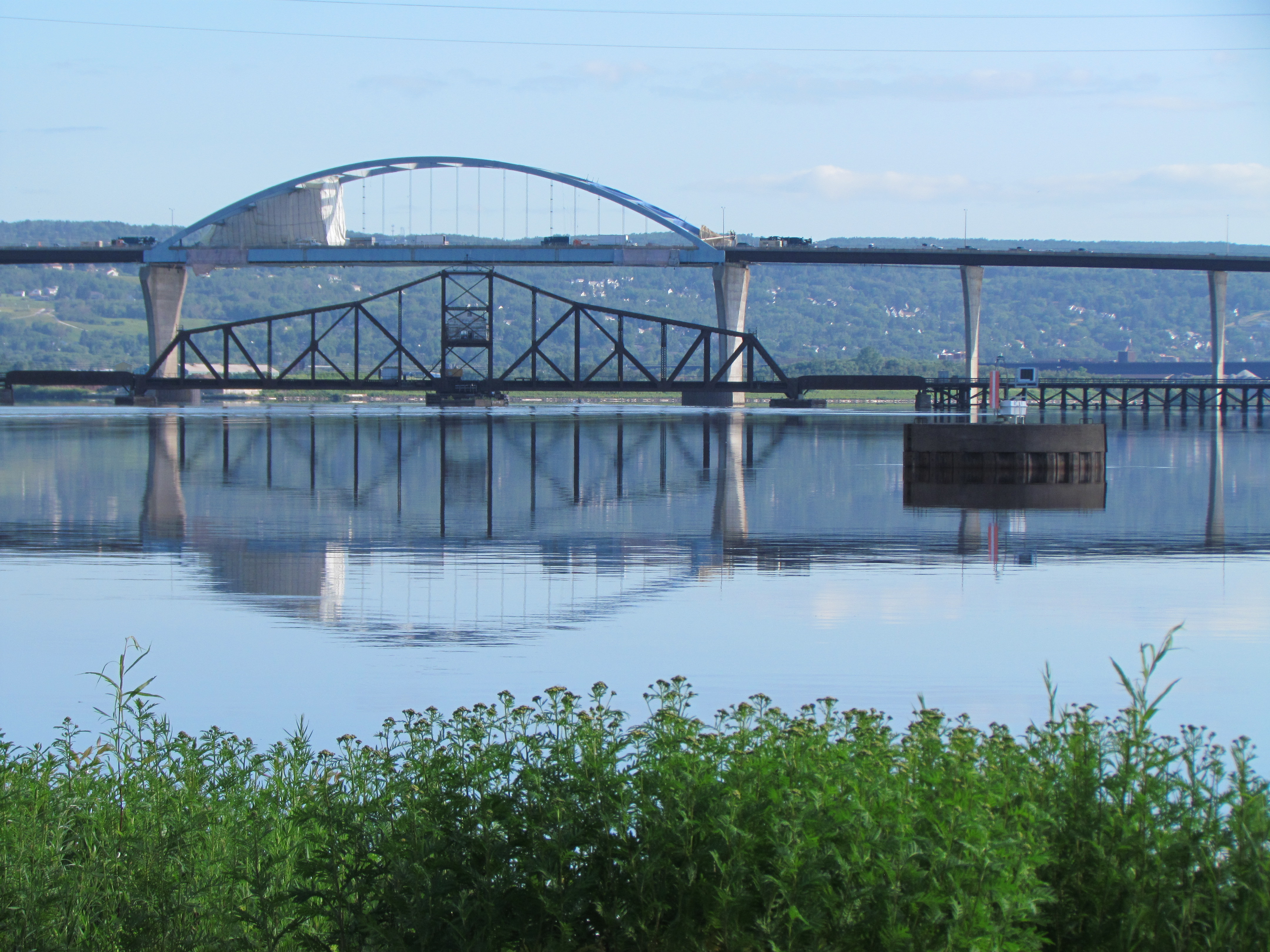 proceeded to cross over the bay on the bridge. The bridge was wonderfully bicycle-friendly, with a dedicated bike lane that was well protected from traffic. As luck would have it, we also had a scenic view of the St. Louis River basin on our side of the bridge. With the rising sun behind us and calm waters in the bay, we had lovely views of the railway bridge and surrounding waterway.