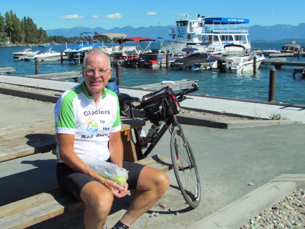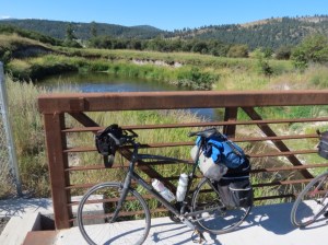 Having gotten an early start this morning, we had plenty of time to take in the wonderful bike trail along the river. We started with a rest stop in the park near the bridge. There we gained a critical piece of information – directions to the nearest ice cream shop along the trail. It was indeed a good recommendation, and we savored huckleberry ice cream cones while overlooking the river.