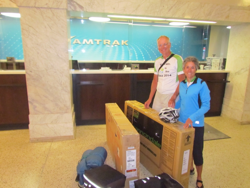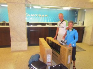 At only $10 apiece to check our bikes, Amtrak was a bargain. It did, however, require some preparation. Stephanie was kind enough to scour the local bike shops to secure boxes ahead of time for us. Guided by Scott's expertise, Rich disassembled and packed each bike securely for the trip. With that, it was a no-hassle check-in at Amtrak. Next year it will get even better. Amtrak has committed to providing new roll-on baggage cars for bikes on all their long-haul trains.