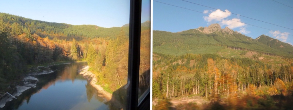 The east-bound trip leaves in the early afternoon, which allowed plenty of daylight to see our way through the Cascade Mountains. With bright sunshine illuminating the fall colors, it was worth watching the scenery roll by. In contrast to airlines, the seats were well spaced and included footrests, and were very comfortable for sitting. Not so much for sleeping. Still, it was a smooth ride and nice to leave the driving and navigating to someone else for the duration.