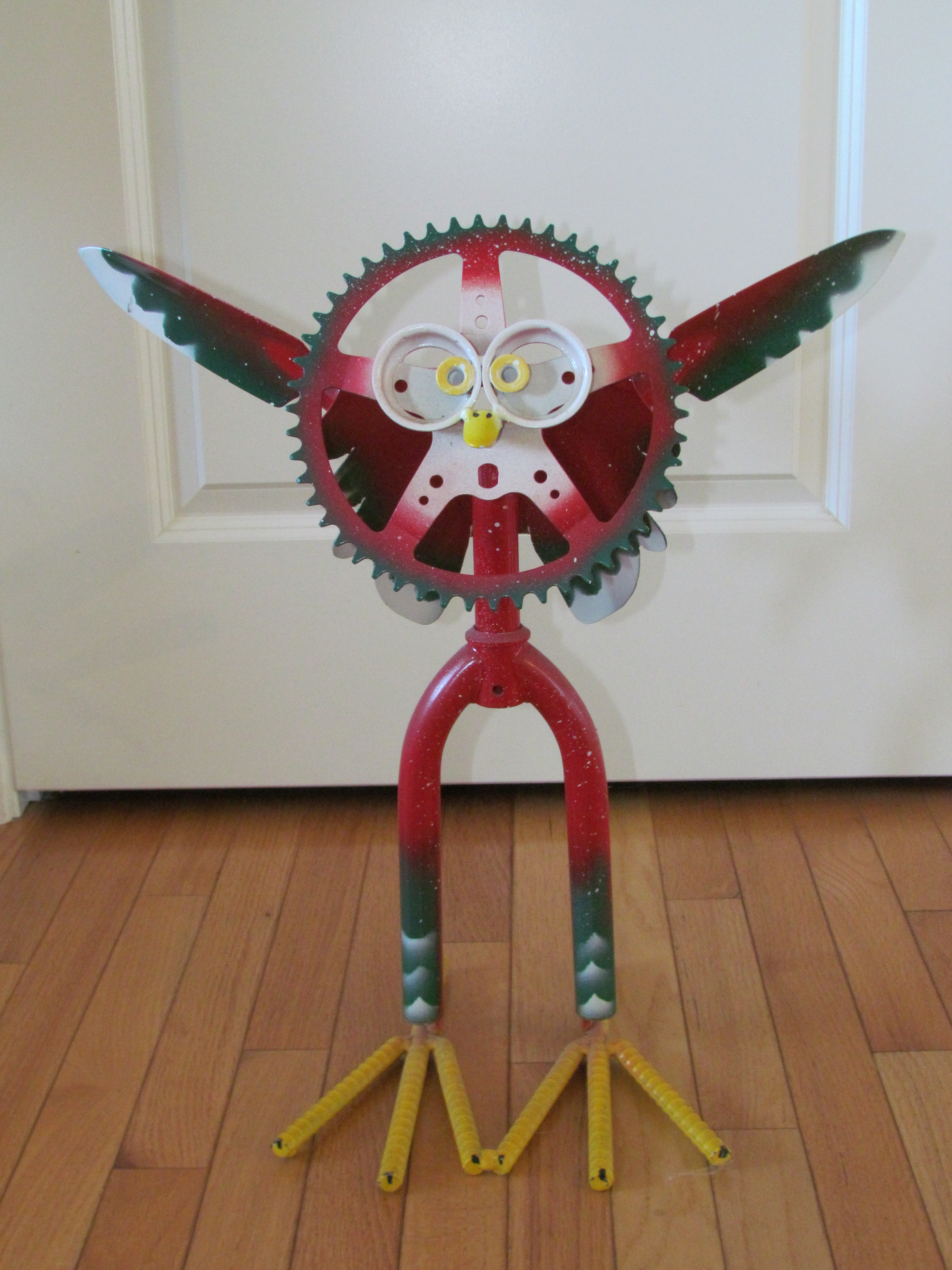 Photo Sep 06, 9 21 10 AM Published October 16, 2014 at 3240 × 4320 in All Things Bicycle Owl made of bike parts