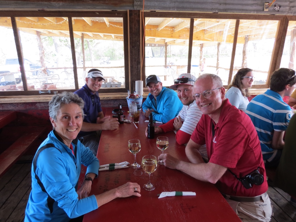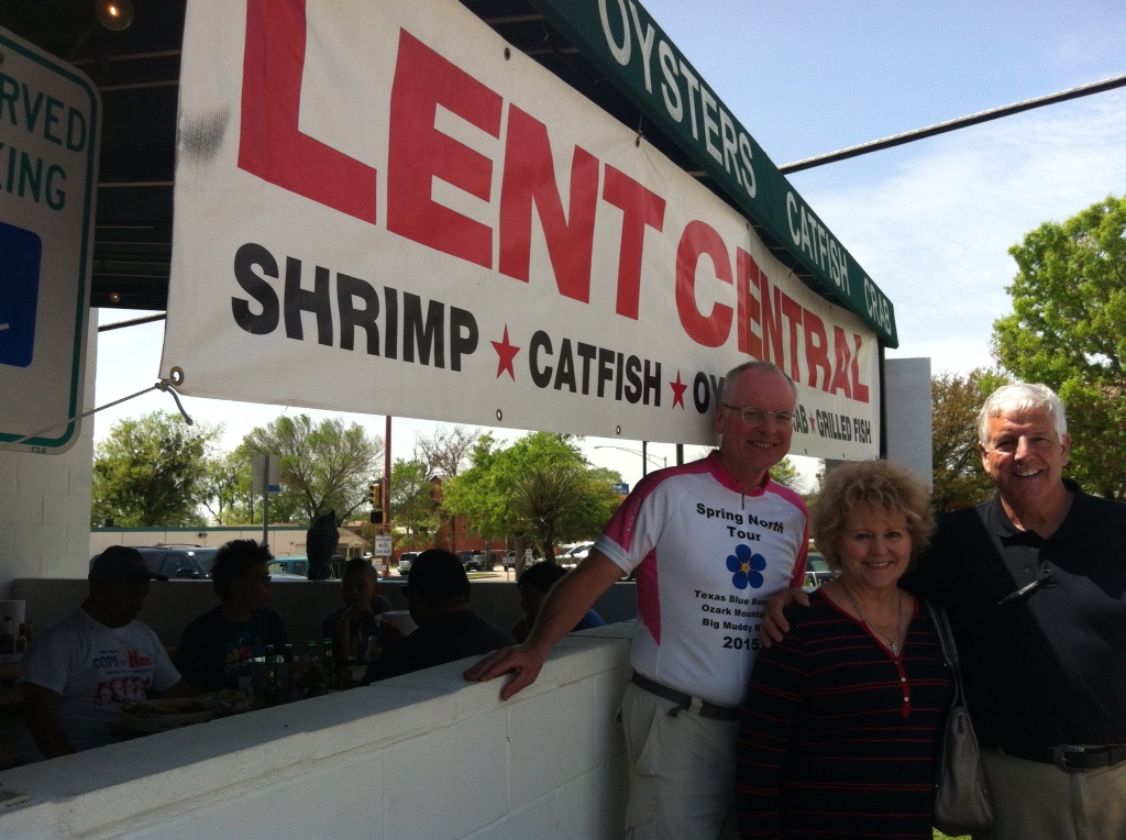 Although my brother, Bill, is a transplant in Texas, he and his wife Phillis have provided a big Texas welcome for the final weekend leading up to our Spring North cycling tour. Our first taste – literally – was en route home from the train station. Being Good Friday and all, they took us to the Flying Fish restaurant in Forth Worth for lunch. They claimed not to know that it had been dubbed “Lent Central” but that seems highly suspicious. Regardless, we enjoyed the local fish delicacies and an outdoor meal.