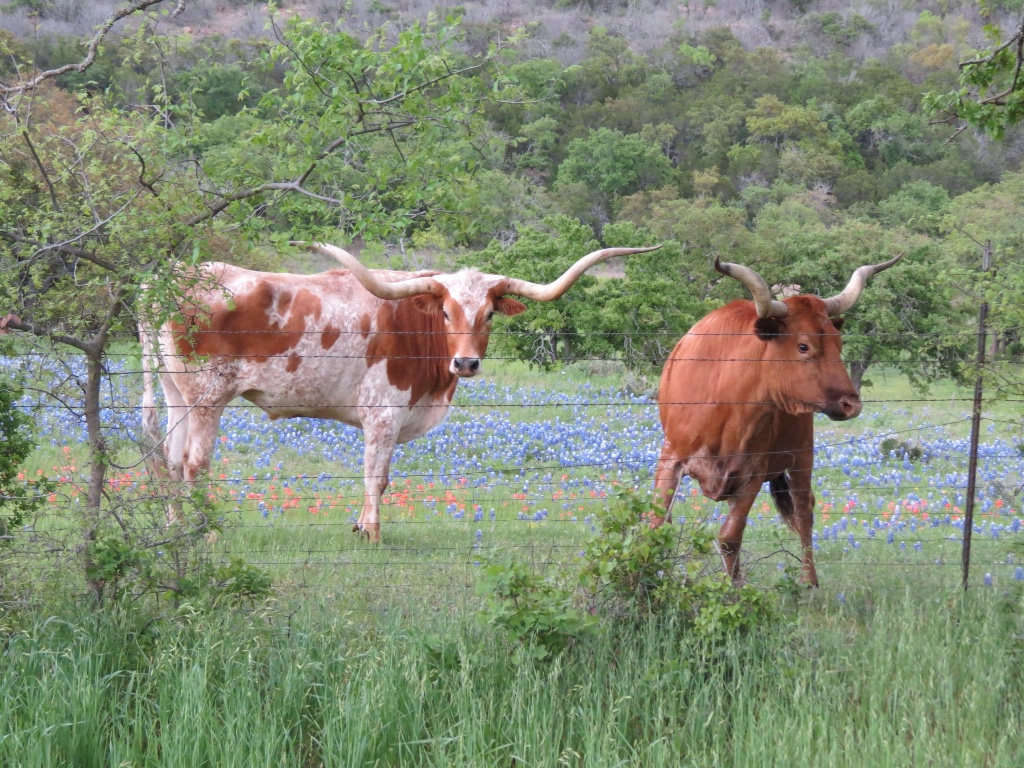 The shoulder on the road had diminished to a narrow crumbly strip, and even on the 2-lane road the speed limit was 70 mph. So we were eager for the opportunity to divert into a smaller road. Before we did, we found a couple of buddies – two Texas Longhorns enjoying the bluebonnets as well. They didn't seem too bothered by our presence and being intent on taking their picture.