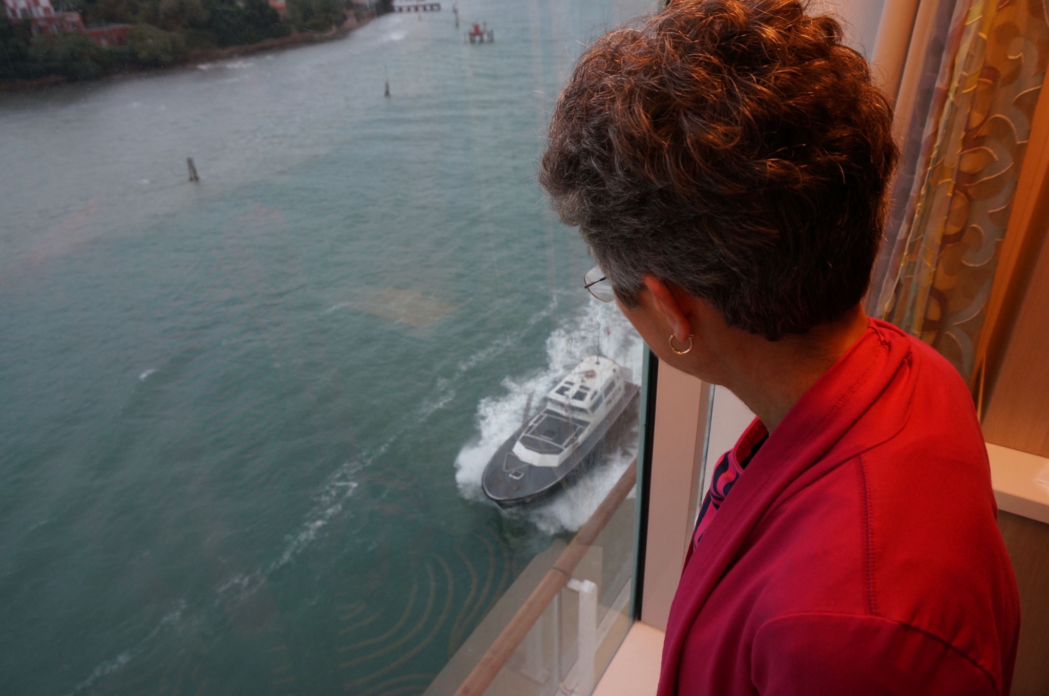 In fact, that position gives us an up close view of some nautical action. We are situated directly above the ship’s gangway, the same entrance used by local pilots who are required to maneuver the ship in and out of port. They are delivered to and from the ship on a small boat and we just happened to see such a rendezvous after departing Venice. We were fascinated to watch the pilot boat sidle up alongside us, match our speed and then duck under the curve of ship to collect the pilot. When it pulled away, there was the pilot climbing down the ladder over the small bow of the boat. Once we knew we had this front row seat, we watched similar performances at other ports.