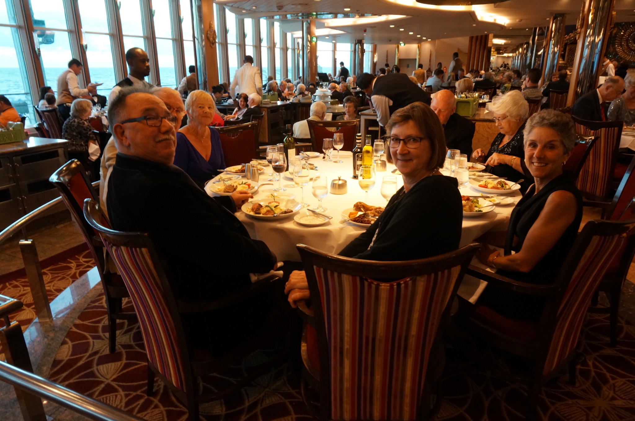 It is impossible to go hungry on a cruise ship. With all the food offerings, it could be a continual feast but instead we restrain ourselves so as to finish the trip the same size we started. A hearty breakfast gets us through the day and we look forward to the elegant dinner that awaits in the main dining room. We are assigned to a table of 10, which feels unwieldy at first. But with each couple hailing from a different country, lively conversations result and we enjoy our new dining friends.