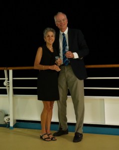 At first I bristled at the idea of two formal nights. What a hassle, I thought, having to add two fancy outfits and all the accessories to my already overstuffed suitcase. But when the time comes, I not only relent but relish the opportunity to dress up a bit and celebrate. Naturally, the ship wants to sell us overpriced photographs to commemorate the evening. Instead, we opt for our own more unique do-it-yourself shot that Rich rigged up on deck. Not bad!