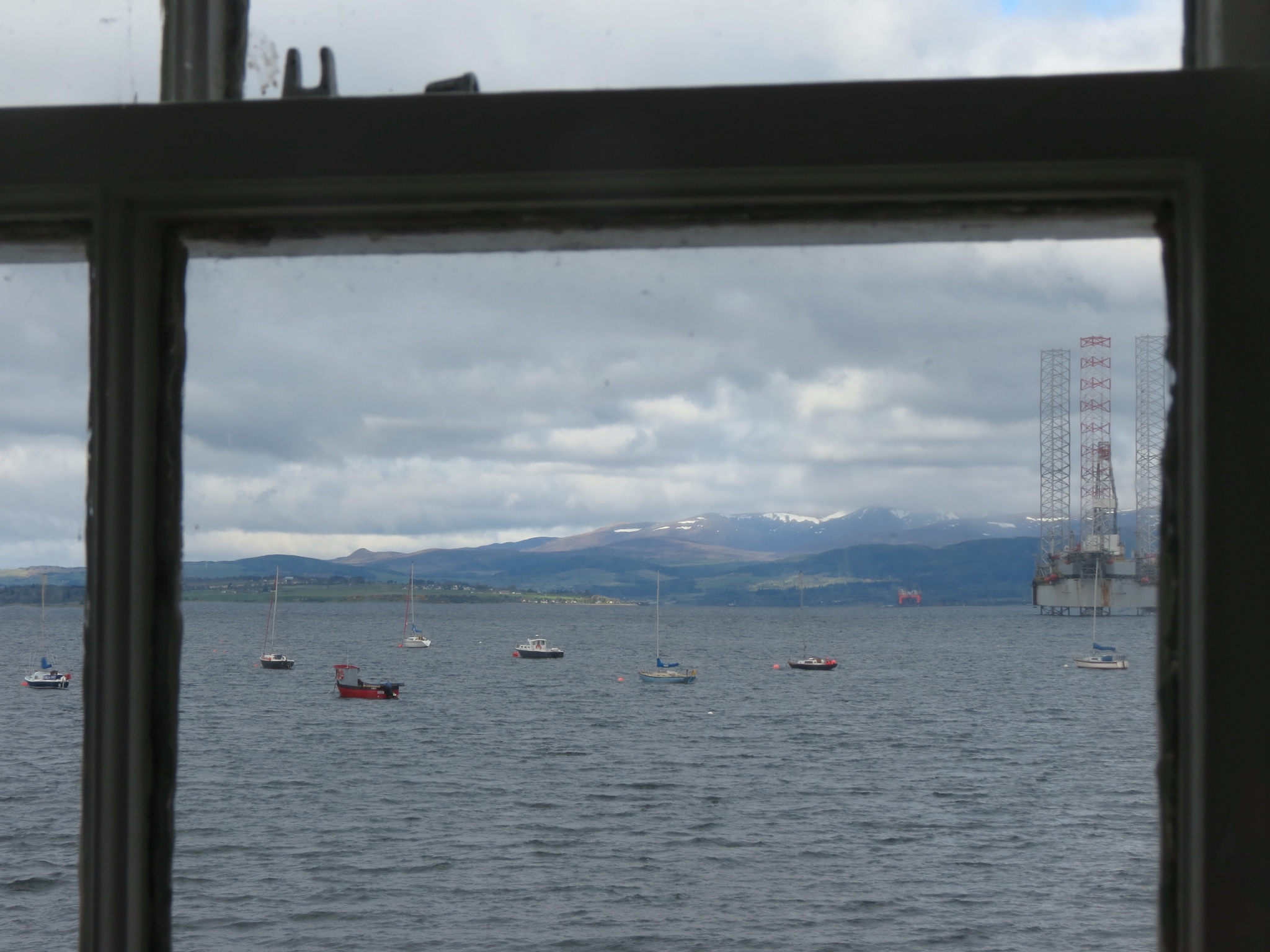 As we neared the end, we rode through the country lane high on the hillside and the sea came into view. On the other side verdant fields rose above the water. It was a rewarding sight, as was the lengthy glide down to the shore and into Cromarty. Entering town, I could see it was neat and attractive with well kept buildings and an air of prosperity. What I hadn't expected (and the guidebooks neglected to mention) were the numerous enormous oil rigs just off shore! Their metal superstructures reaching high into the sky, they were impossible to miss. What an odd juxtaposition to the fishing boats bobbing nearby.
