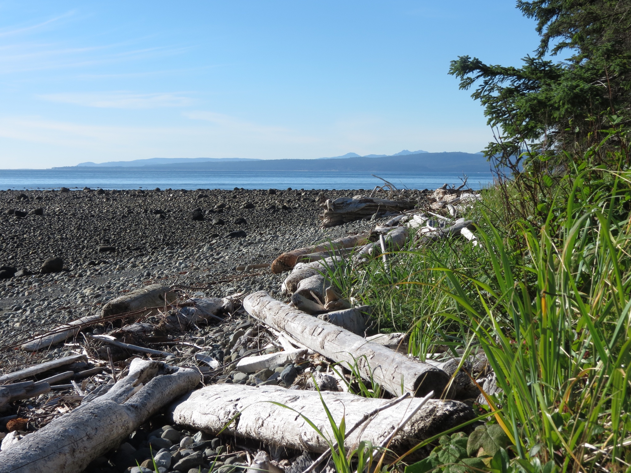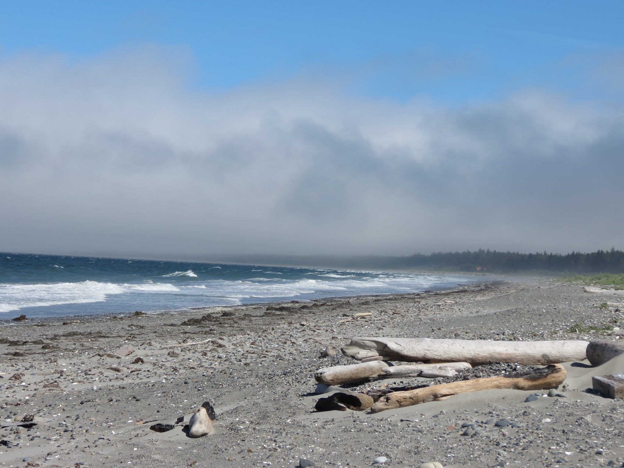 Weaving through dark old growth forest, it emerged onto the dunes and beyond lay the beach! The scene before me was entirely different from the east coast. Here was a raging sea. The wind was fierce and waves crashed on a beach strewn with seaweed, shells, rocks and driftwood. I didn't linger long by the water, choosing to retreat to a sheltered spot on the dune where I could observe nature's fury. Although I had blue skies overhead, a low line of fog and clouds rested on the water. Looking to the far end of the beach, it disappeared into the same fog bank. Tow Hill was nowhere to be seen, cloaked in mist. Perhaps it wasn't the best day for camping after all. That salved my disappointment, slightly.