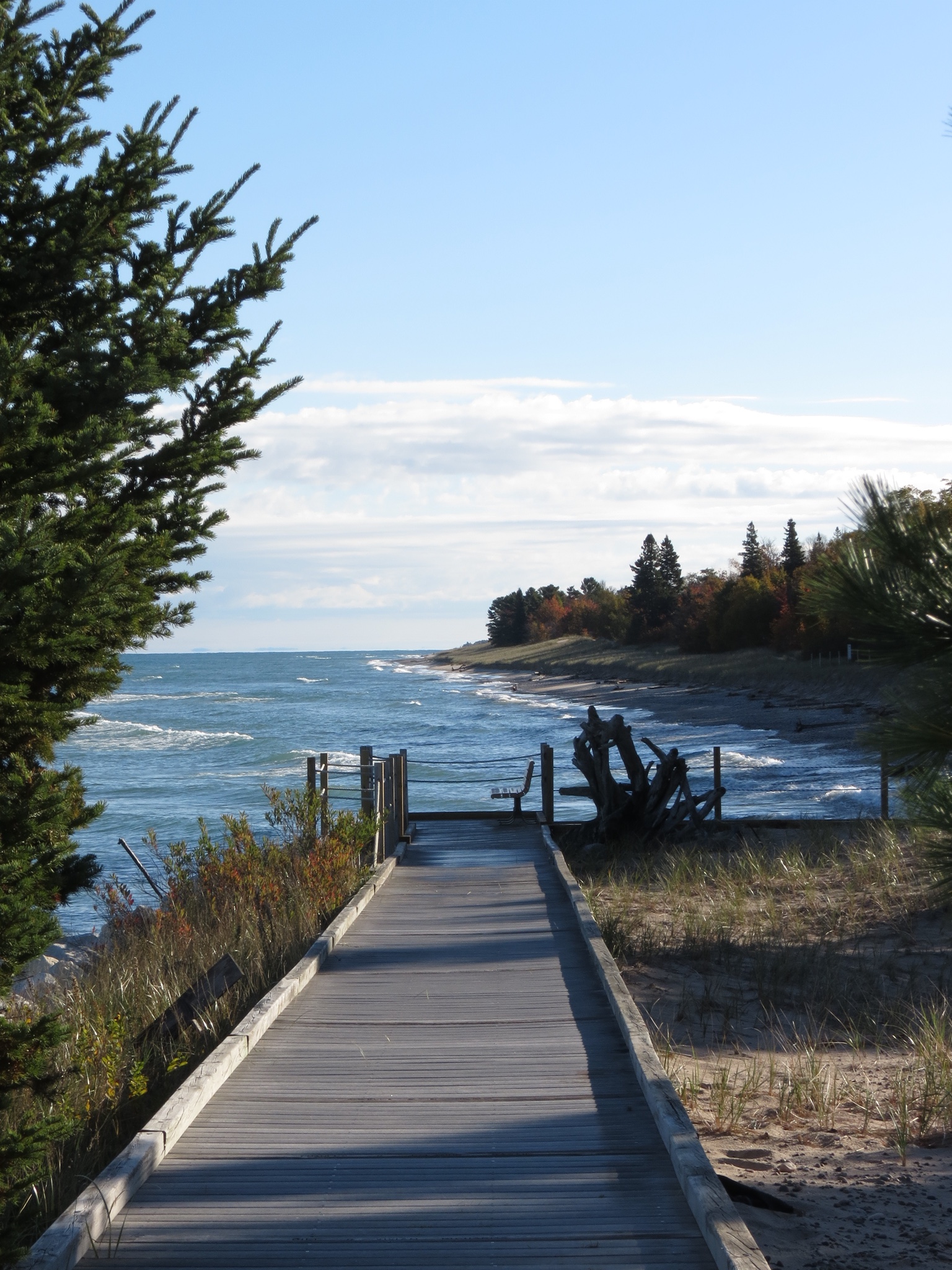 Thinking that the week could not be more ideal, we are treated to a grand finale. We witness a deep pink sunset from the beach. We have the biggest blazing bonfire yet. Two classic ore boats parade by, illuminated stem to stern with white lights. We watch a glowing sunrise from the lighthouse tower. And the day is balmy and warm.