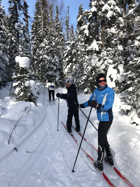 We made rapid work of choosing beds and dumping our bags. The Flathorn-Gegoka cross-country ski trails awaited right outside the door. As soon as we could strap on our skis, we set out to make the most of the remaining daylight. Brilliant blue skies and warm sunshine offset the blustery wind, and soon we were sheltered by the deep forest. With two-feet of newly fallen snow freshly groomed into narrow single classic tracks, we brushed shoulders with tall pines. Branches laden with mounds of snowy fluff, sun peeping through, all sounds but the swish of our skis were muffled by the soft whiteness.