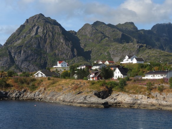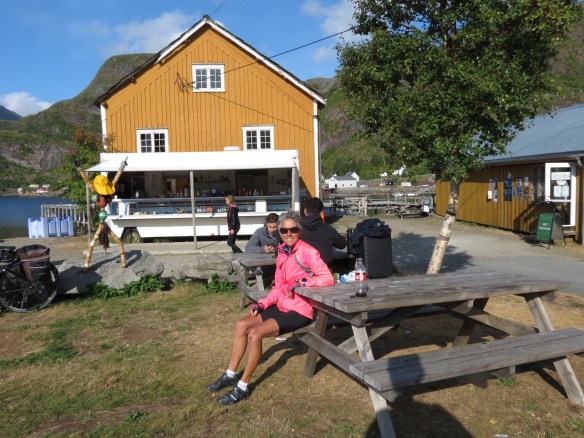 We had only five kilometers to cycle to Moskenes to catch the ferry to Bodo, on the mainland. It was no hardship to wait for the ferry in the warm sunshine, surrounded by mountains.