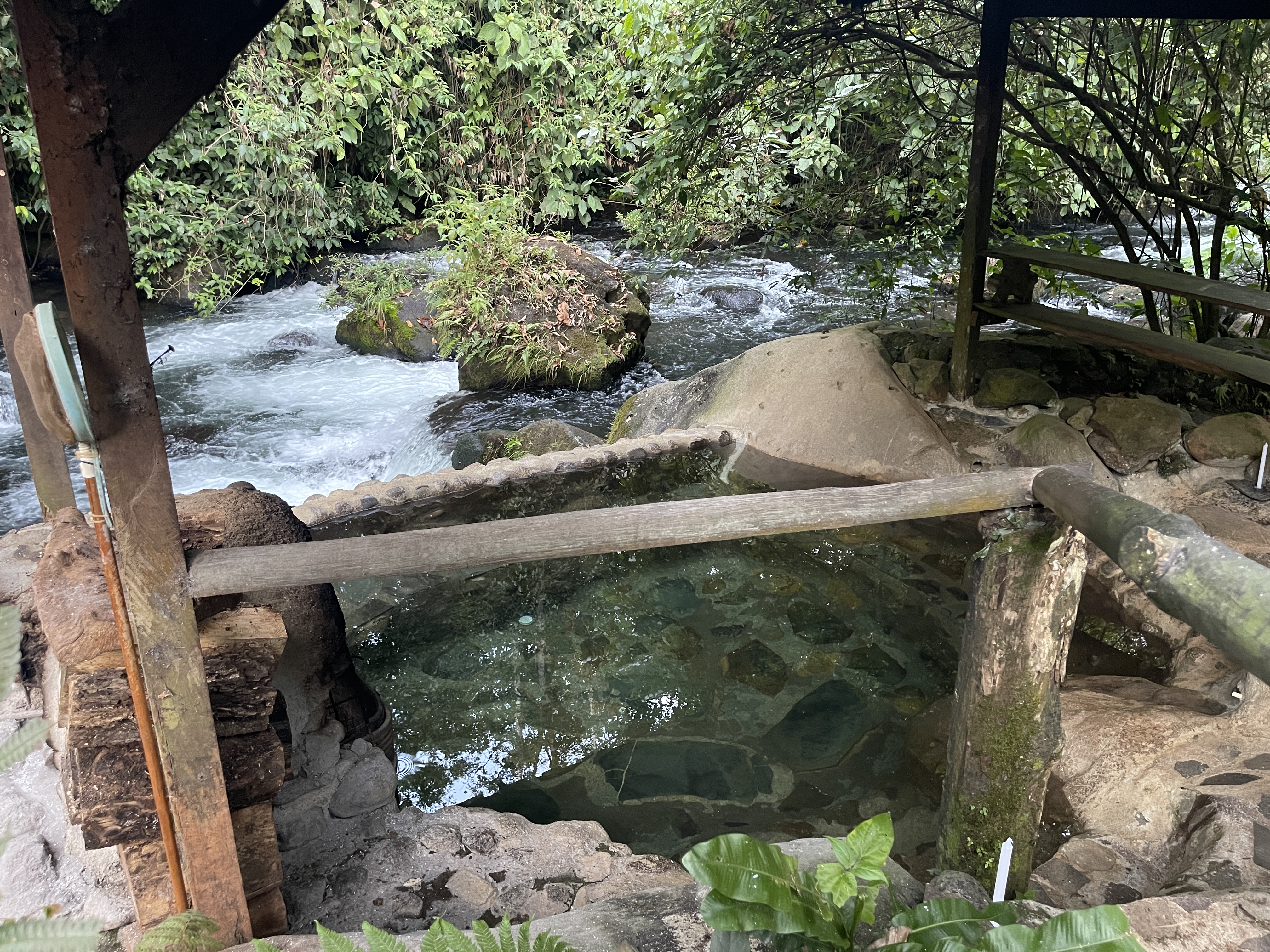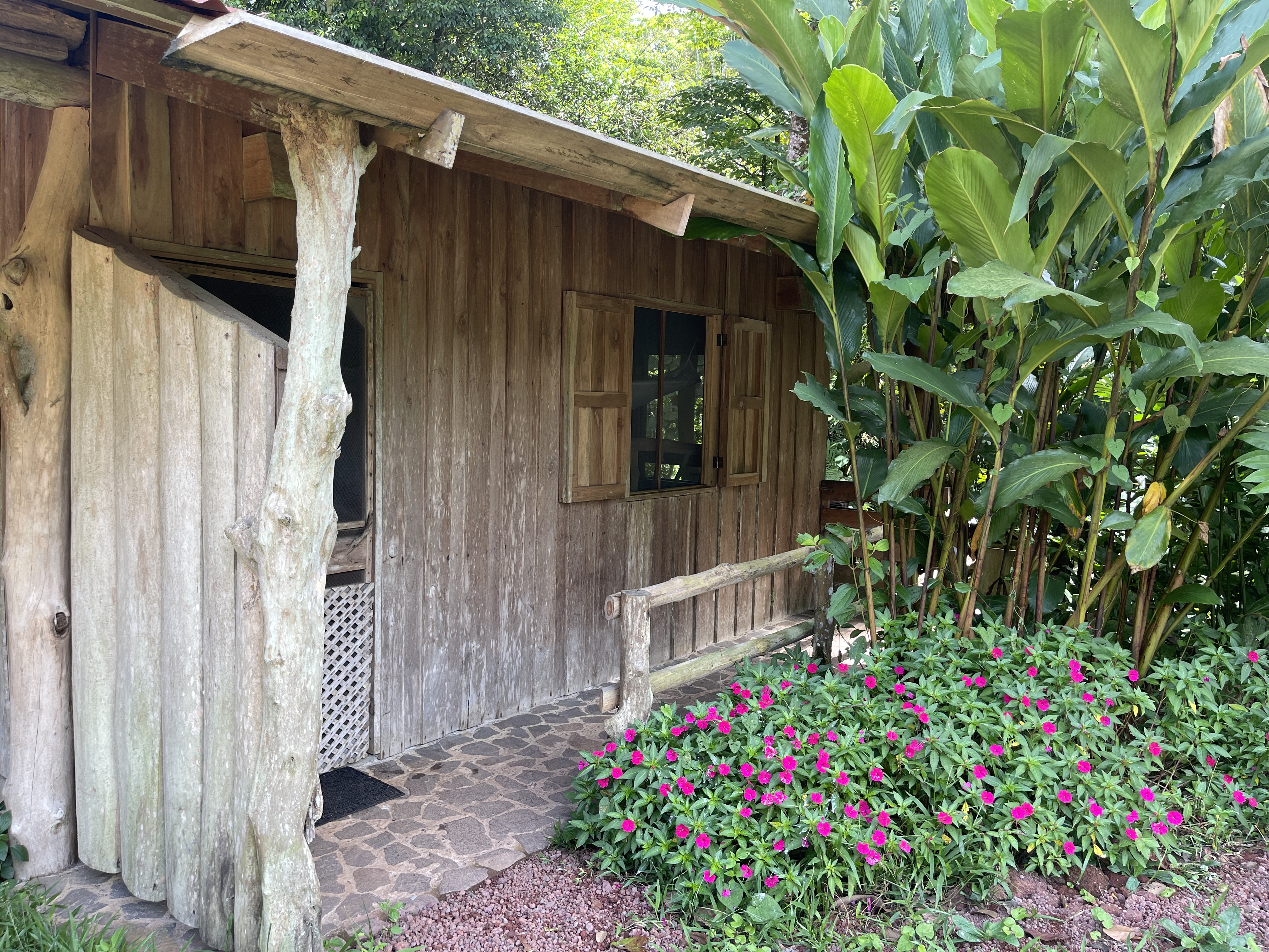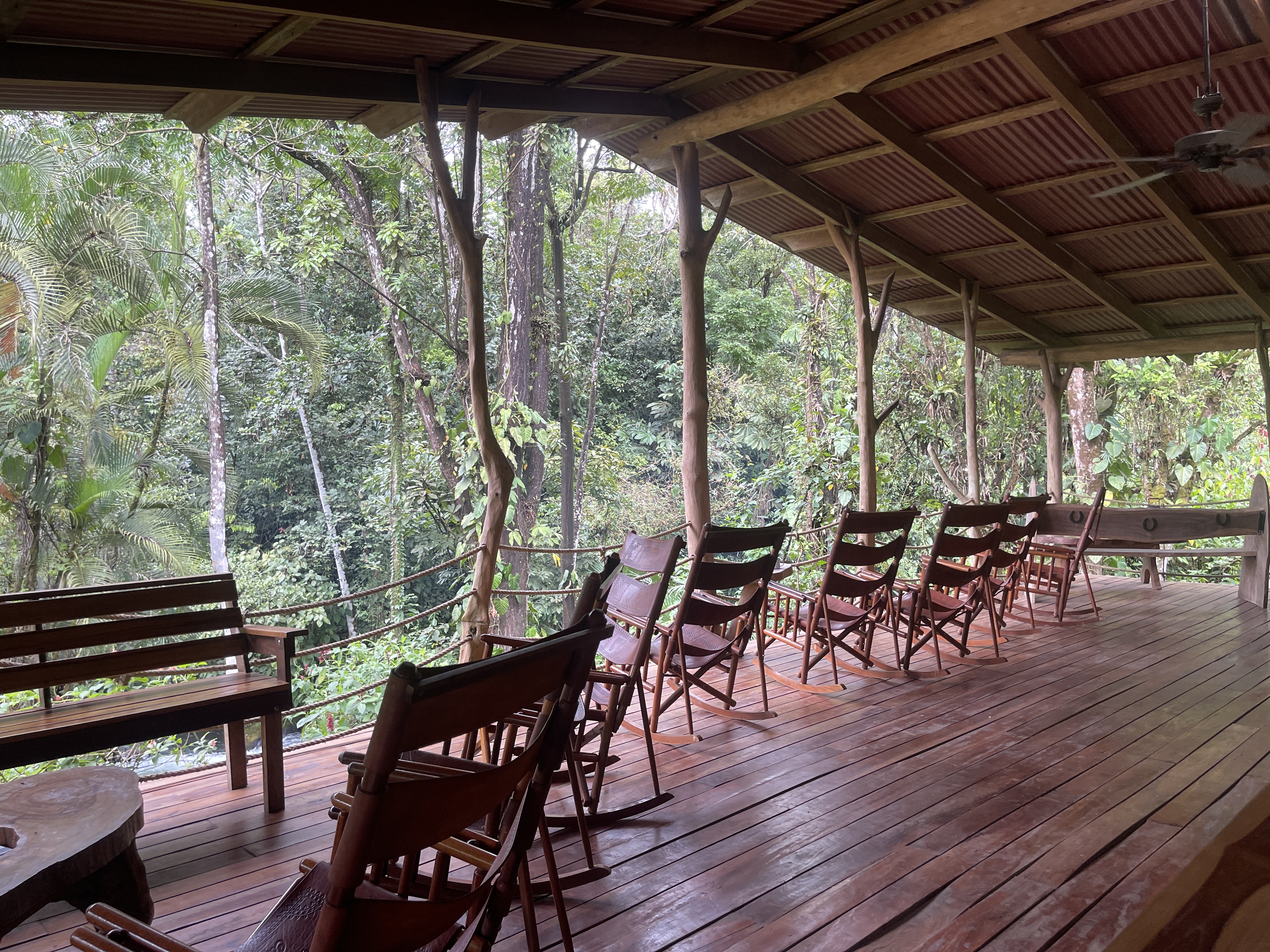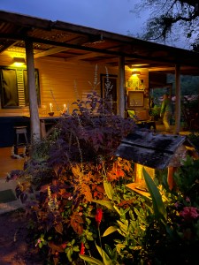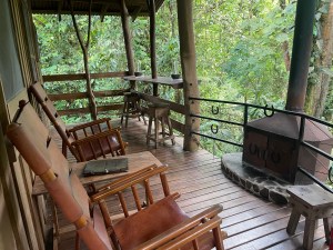 Ready to shed the outside world, Rich and I along with our friends Jon and Beth were shown to our cabins, nestled in the tall leafy environs sprinkled with brilliant flowers, and bordering the fast-flowing river onsite. In keeping with the eco-lodge essence, they were simple but comfortable, with overhead ceiling fans, windows for good cross-ventilation, mosquito netting hanging over the beds, a few lights and electrical outlets, and a bathroom with shower. The best feature was the deck facing the river with wooden rocking chairs, a counter with stools and wood fireplace. Jon and Beth, situated in the “honeymoon cabin” next door, had a personal wood-fired hot tub (which the staff kept stoked) and a hammock as well. Those would become our favorite living areas.