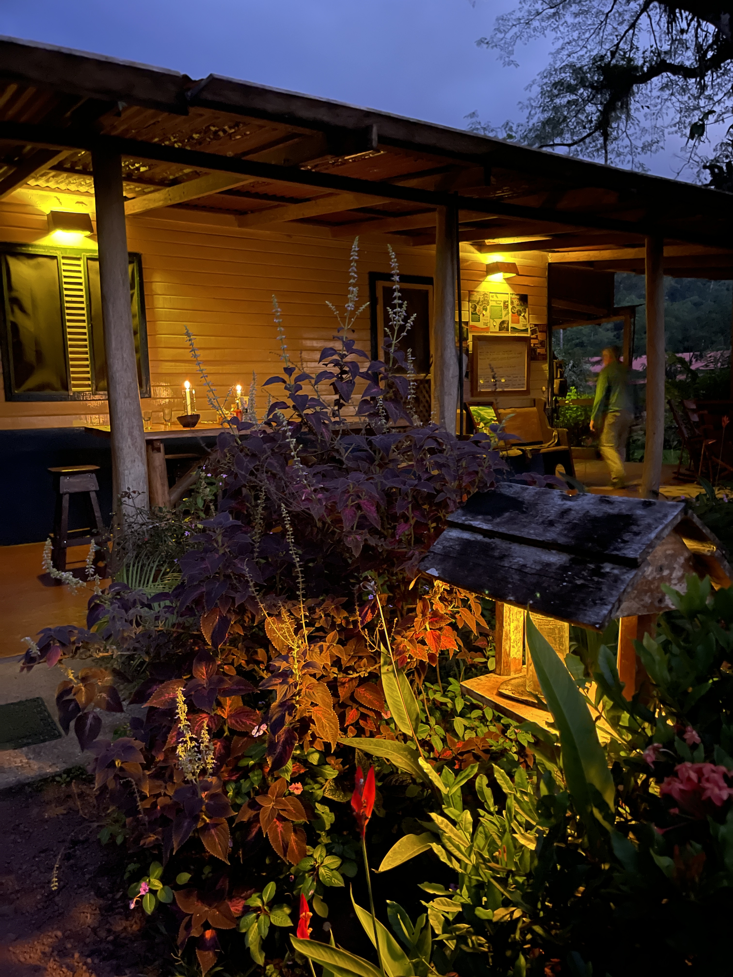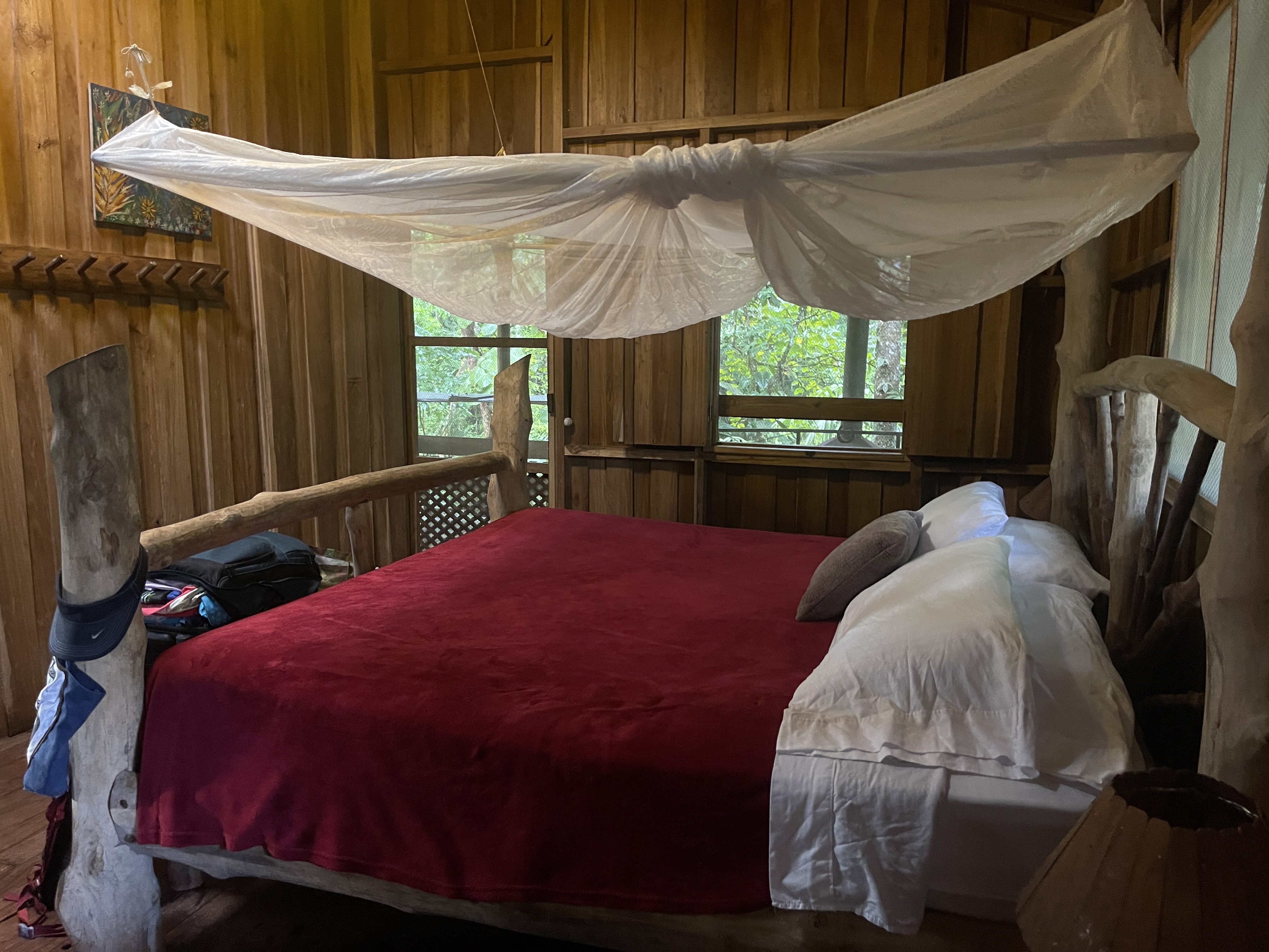 We wondered if we might be hot during the night. Throwing all the doors and windows open to catch the breeze, we were surprised to sleep comfortably even under the red wool blanket. Not once did we deploy the mosquito netting. Waking during the night, my eyes sought the windows where I saw only the blackest of blackness accompanied by the roar of the river, sweet white noise.