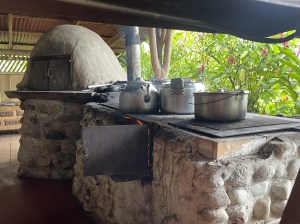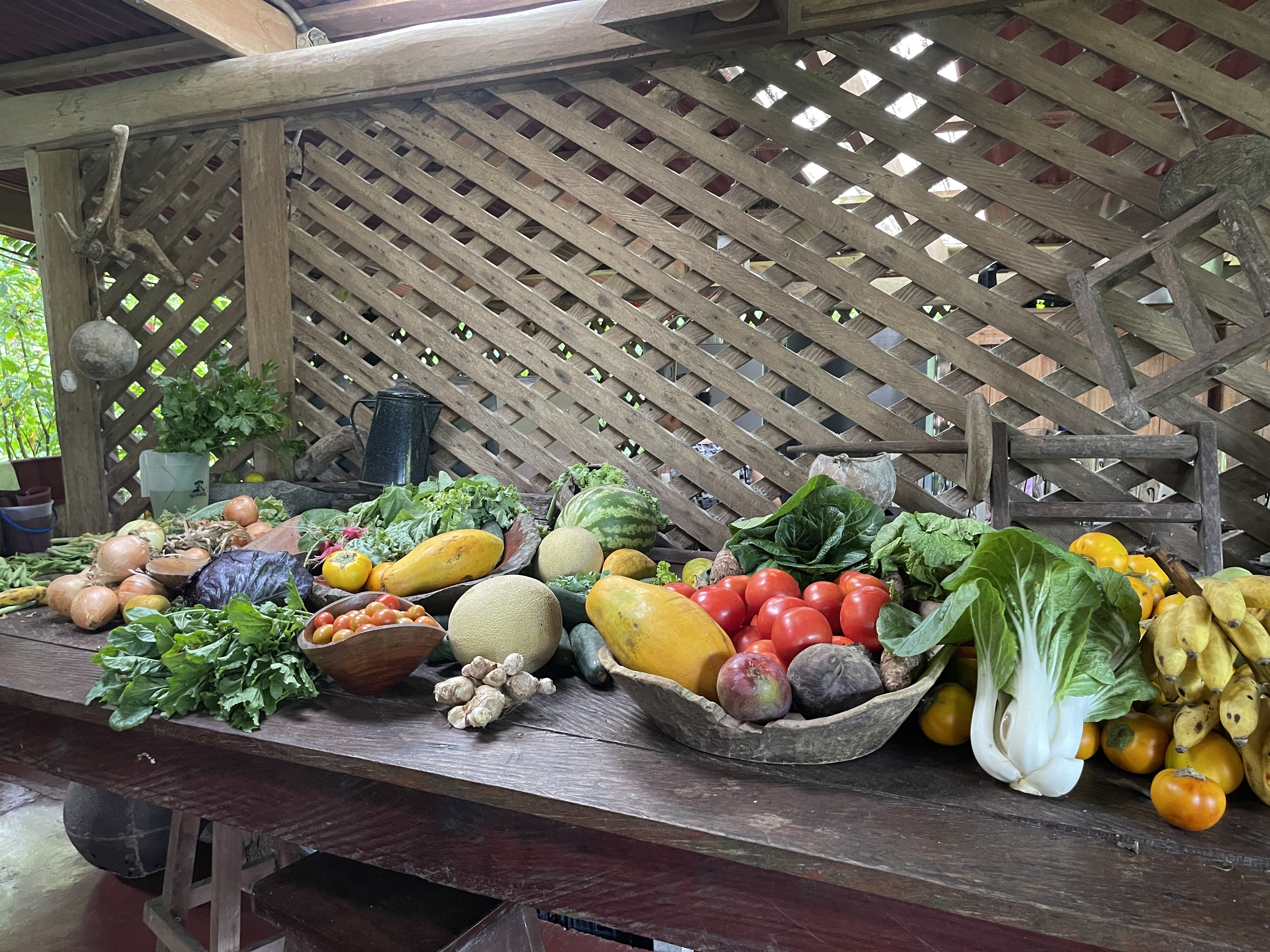 We arrived in time for lunch, and made our way to the lodge for our first dining experience. Tables set for individual groups circled all four sides of the open air building, and we were shown to a table just opposite the kitchen prep area. We could see the wood-stove and oven off to one side, and a long table laden with a colorful array of fresh fruits and vegetables (which we noticed dwindled during our stay!). We faced the garden area outside, the epi-center of bird watching.