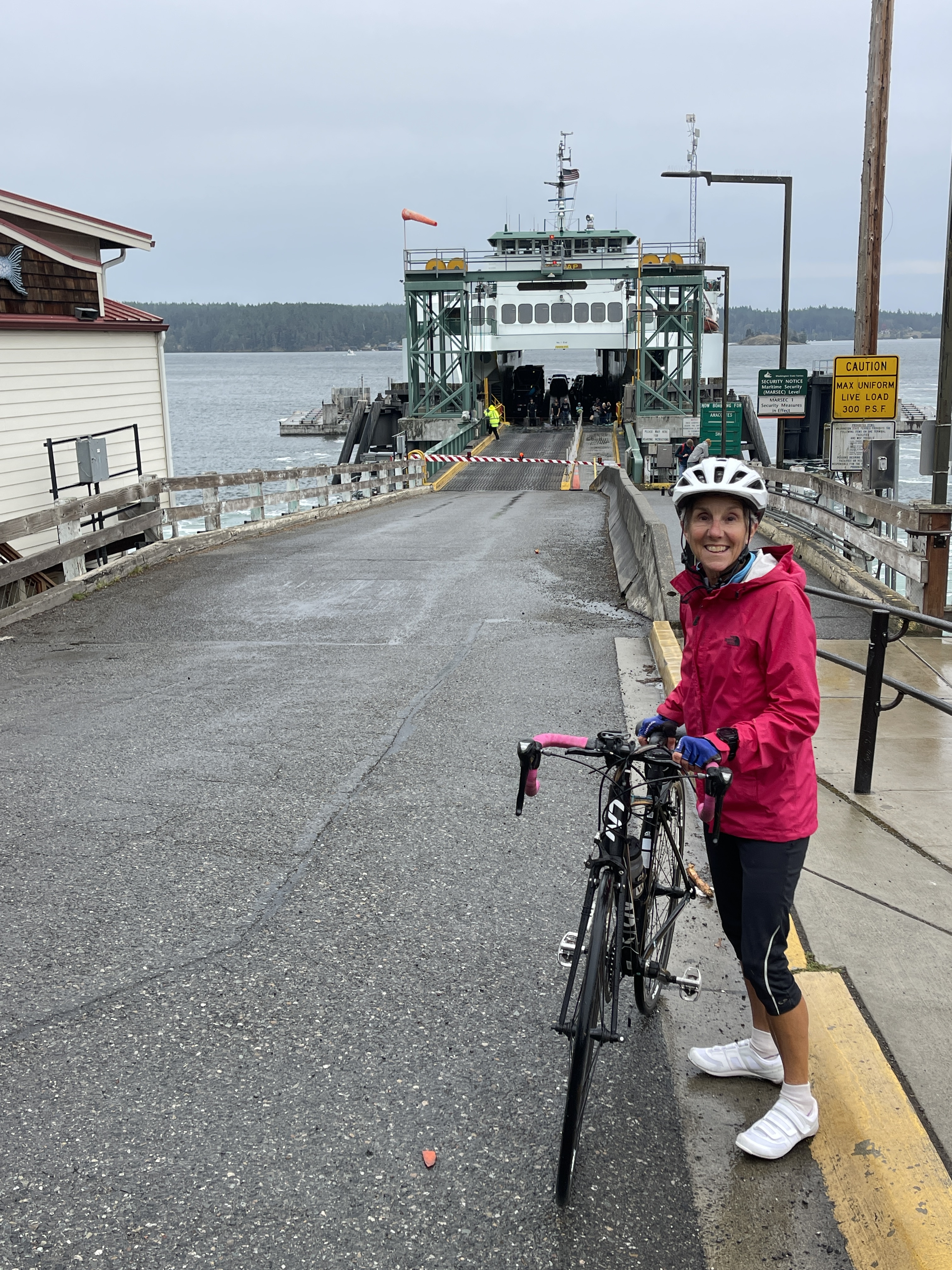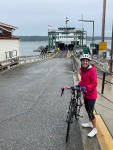 With clouds gathering overhead, we forged on toward Deer Harbor on the west arm. Just as the raindrops began to fall, a large parking lot materialized and we quickly stopped to don our rain jackets. Undeterred, we pushed on, determined to complete our tour. The road followed the shoreline, both flattening out slightly and giving us wet views of West Sound and a marina populated with sailboats. When we reached the Deer Harbor Inn just short of town, we did a time check. “I’m not sure there’s a later ferry,” Erik admitted. Calling it good enough, we turned around and pushed our pedals back toward the ferry landing. Sailing down that final steep hill, we could see the ferry chugging up to the dock.