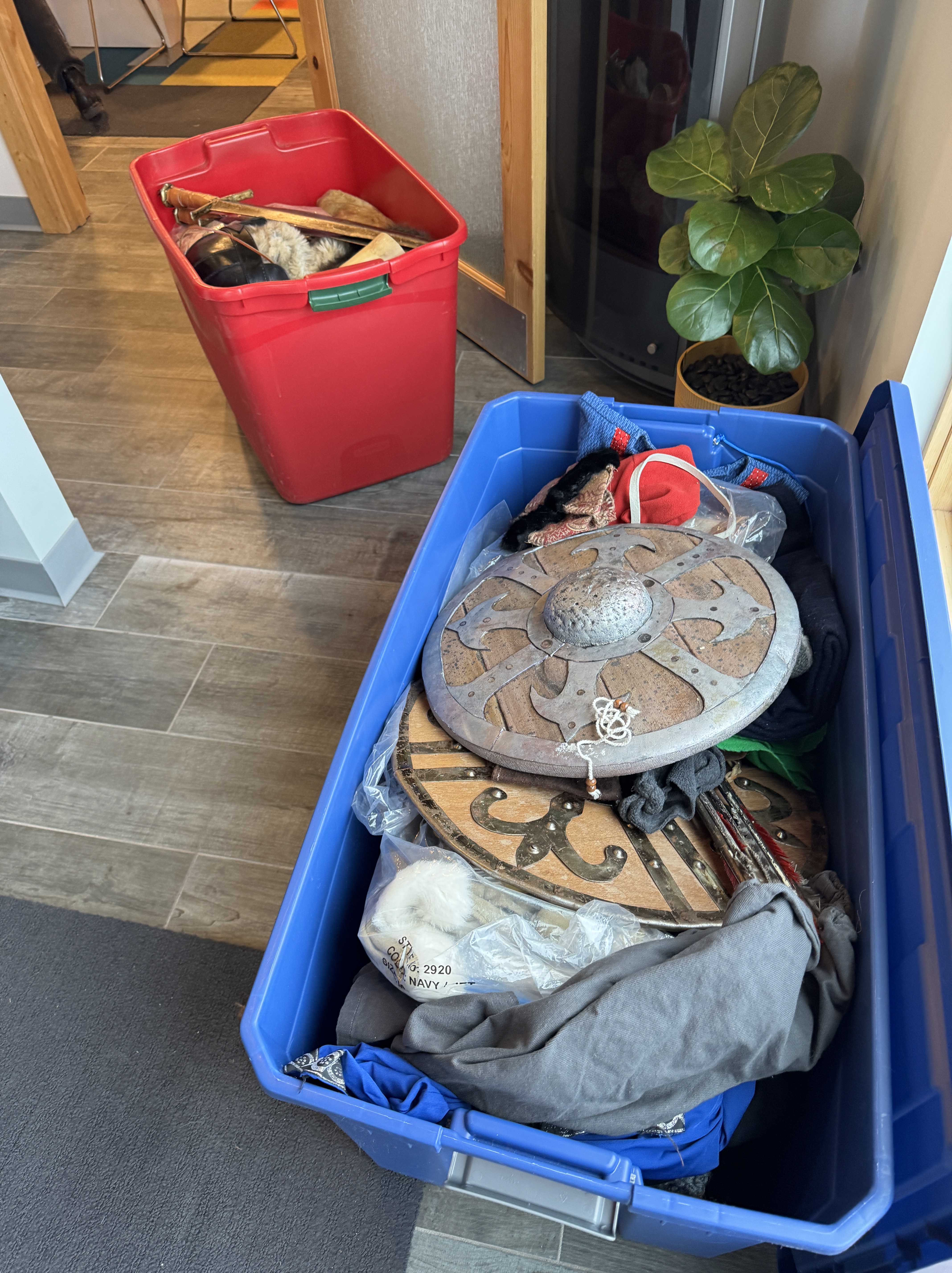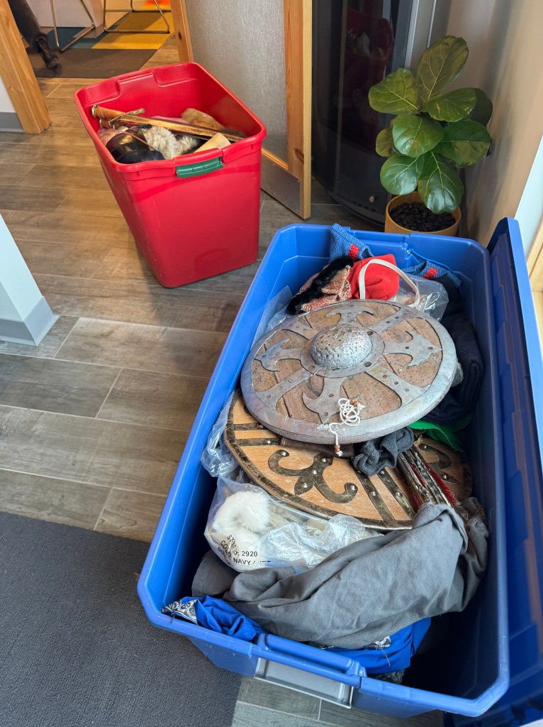 The first task was assembling costumes. They were required to furnish their own wooden skis for the race, which they borrowed from ski collector friends or old family skis. A party ensued to coat the bottoms with pine tar, using a blow torch to melt it in. The Birkie has an assortment of clothing pieces in three big tubs, and after sifting through the jumbled contents they put together convincing Warrior garb.