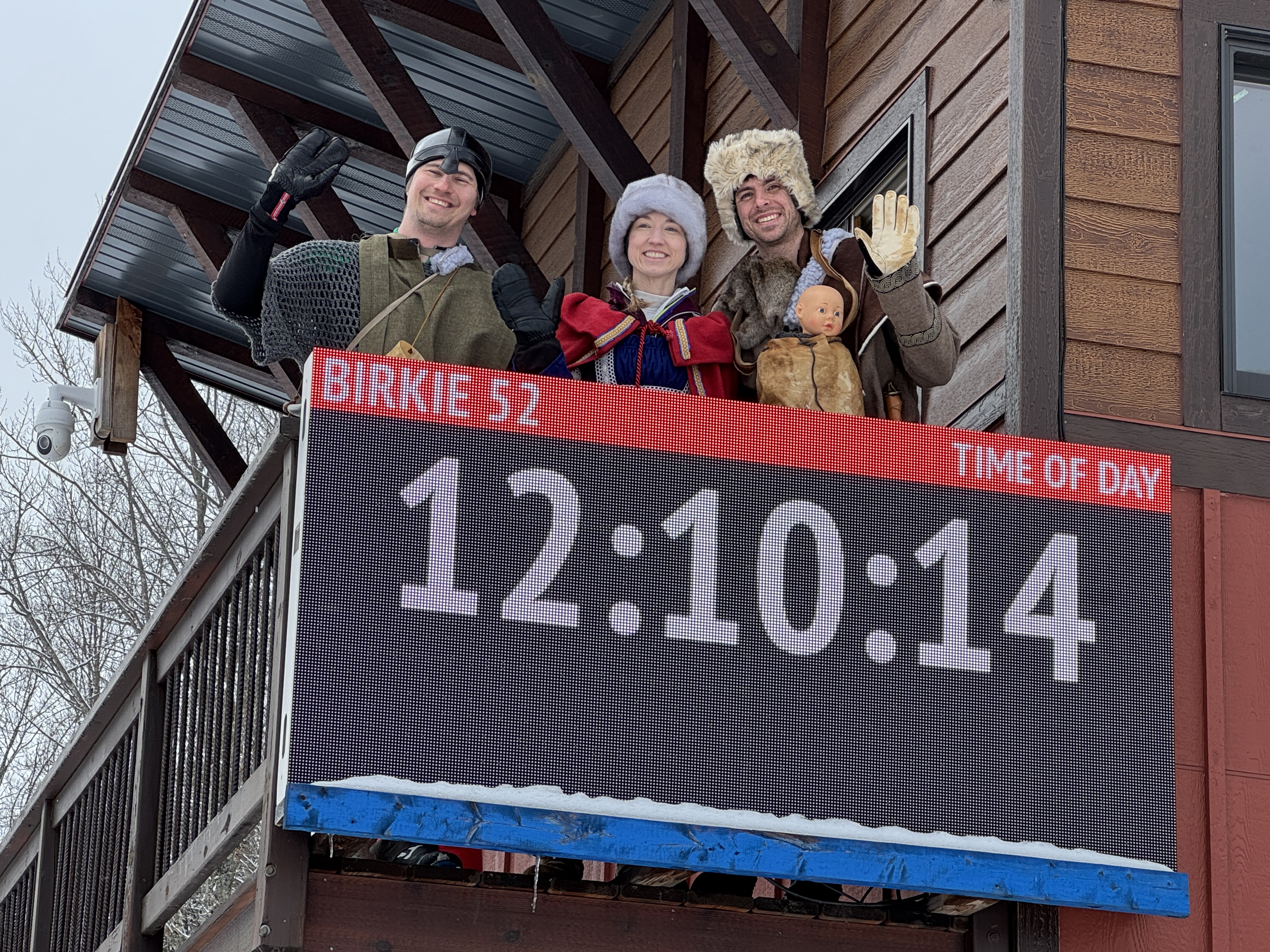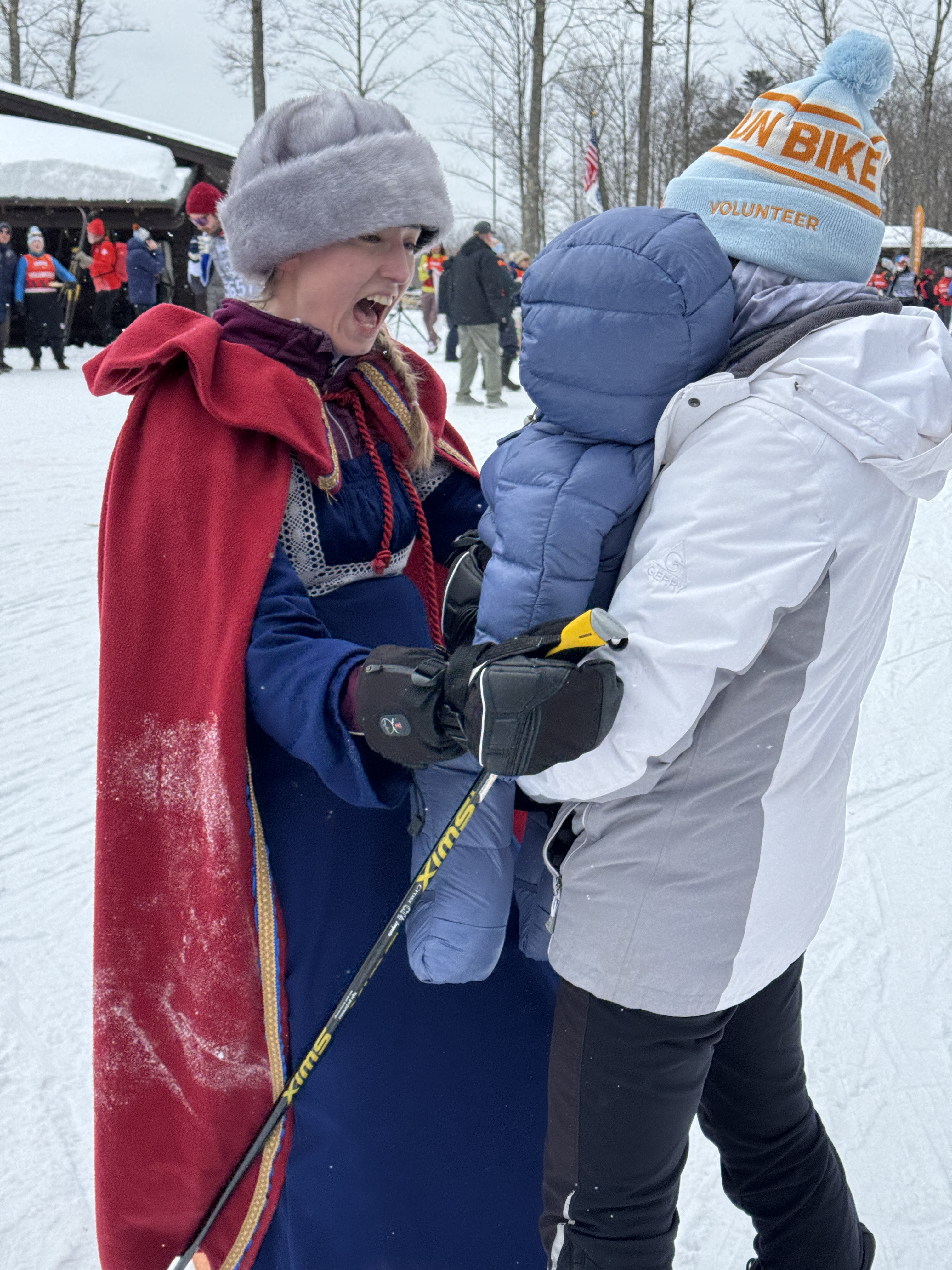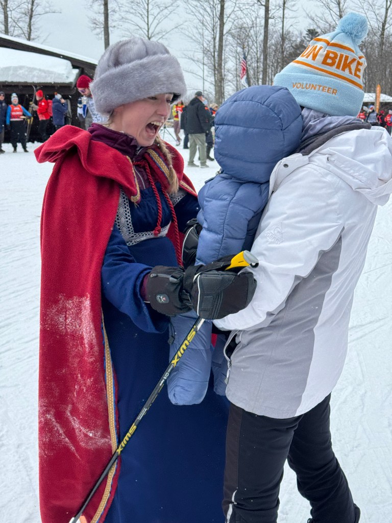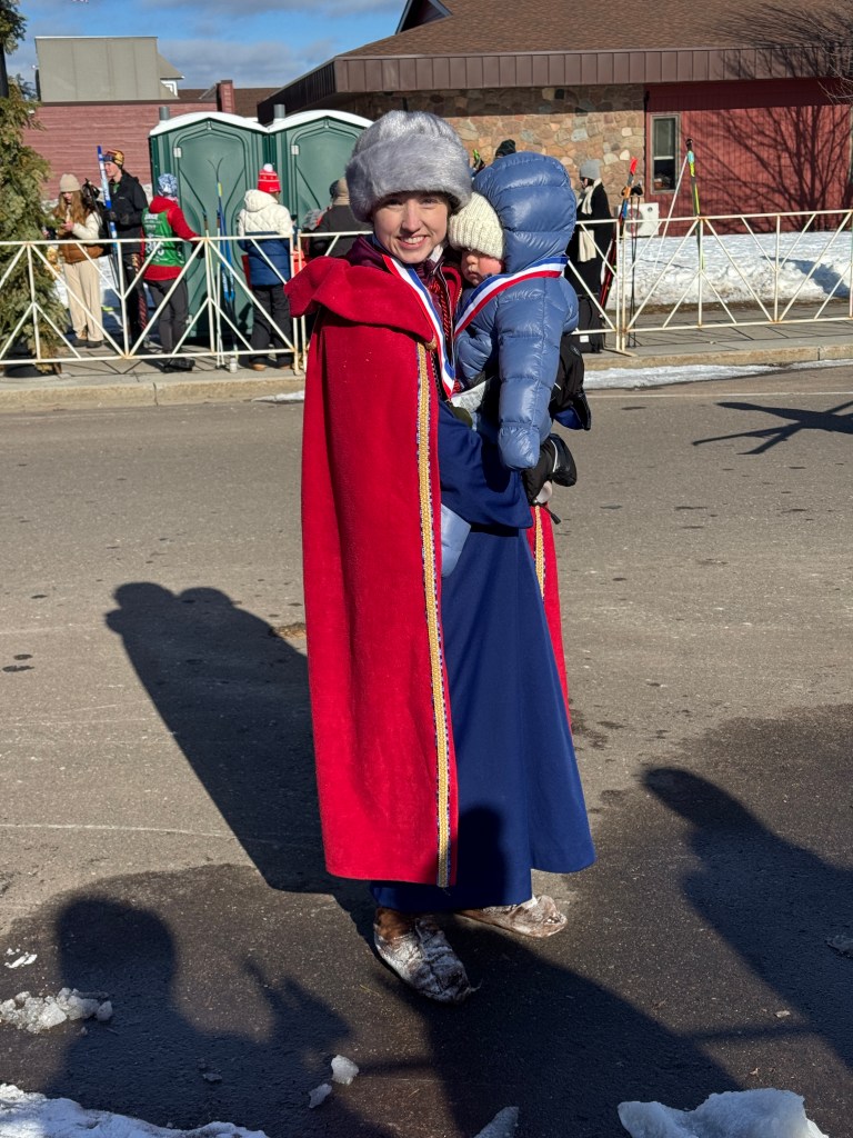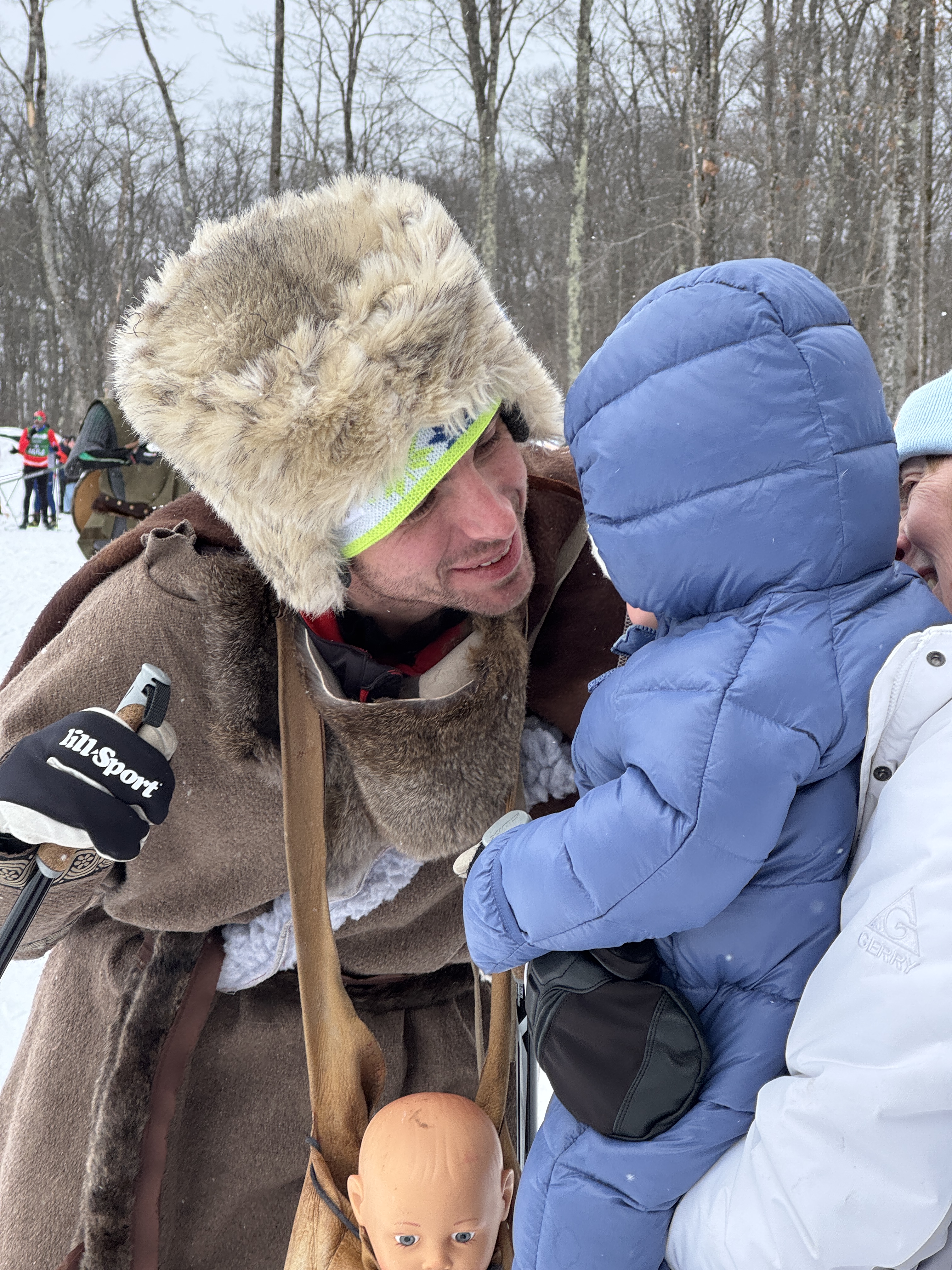 The big event was on Saturday, skiing the full Birkie course along with thousands of racers. In the early morning hours, I delivered the Warriors to the race course where they lined up at the start line in front of all the other skiers and headed off down the trail! It was far too early for baby Saige to be up, so they skied with a baby doll as a stand-in for Prince Hakkon.
