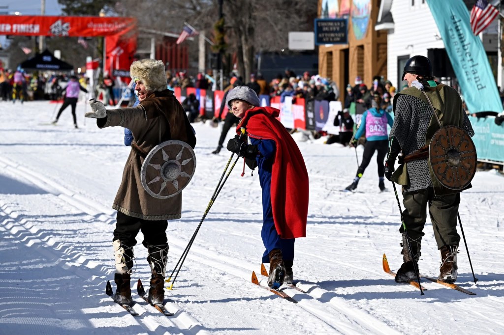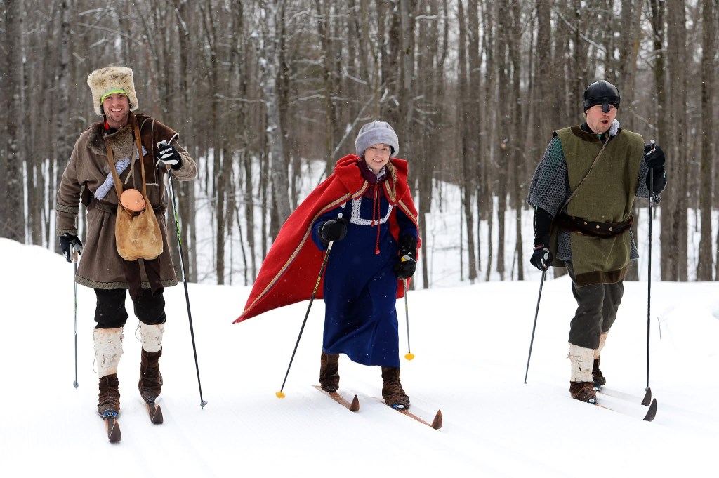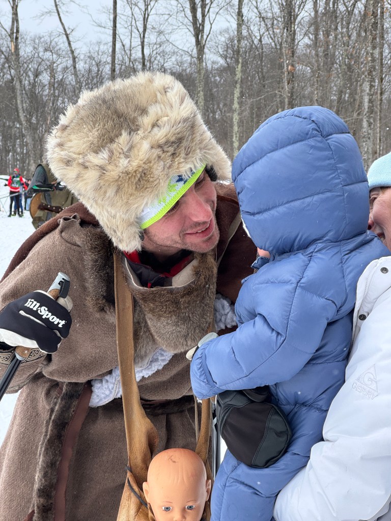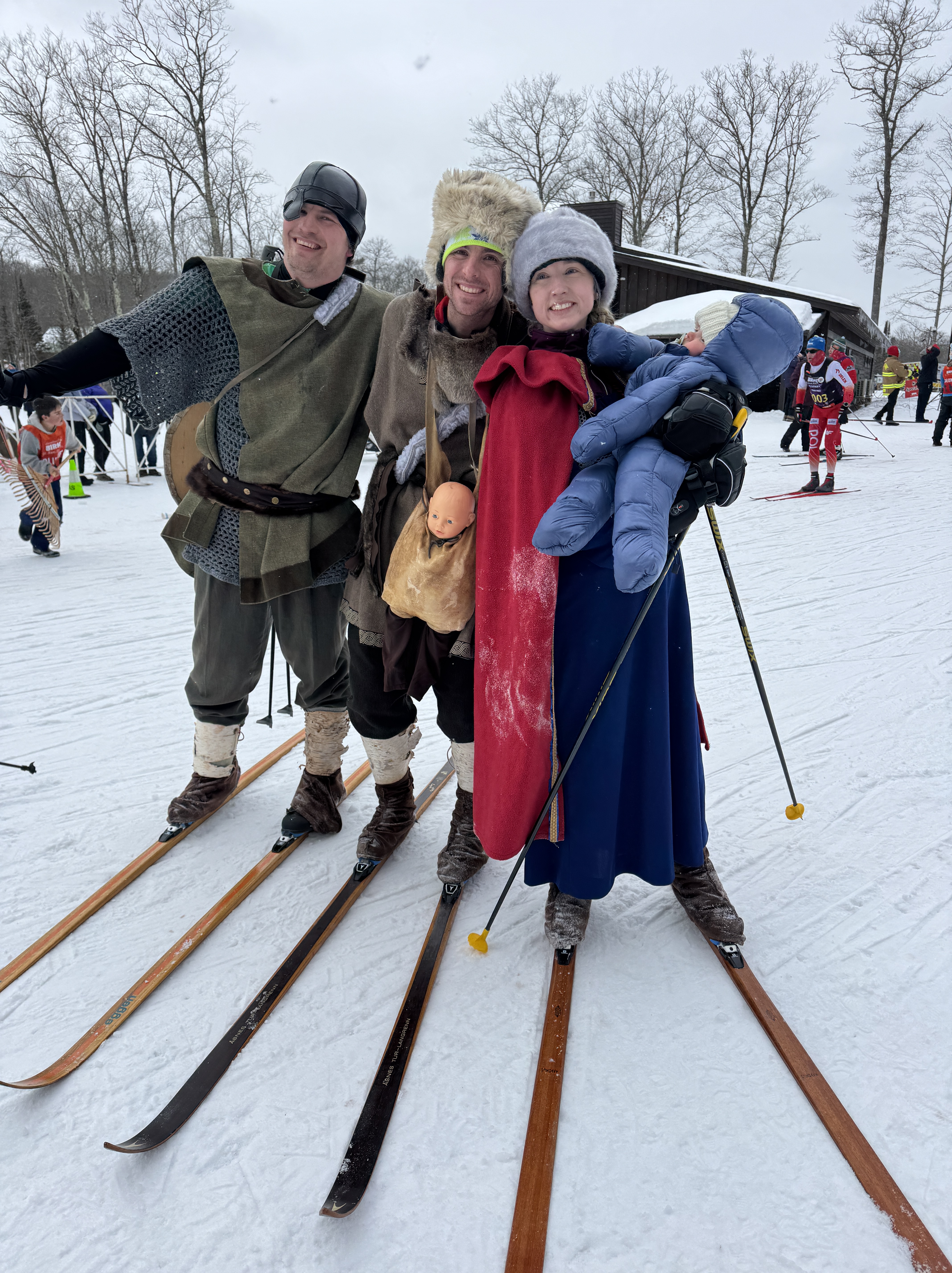 The American Birkebeiner selects three skiers each year to recreate the Warriors’ journey. They are the mascots of the 5-day Birkie event schedule, culminating with skiing the 53k Classic Race in costume and on wooden skis with either a real baby or a doll.