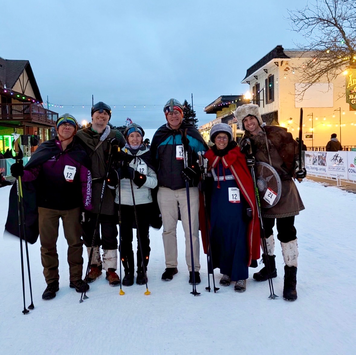 On Thursday night we entered team “Haakon’s Entourage” in the Giant Ski race, along with Rich and Dick, all in warrior costumes. With Katie back at the cabin attending to Saige, I was drafted to be Inga for the night. Half the fun was seeing the silly costumes on other teams.
