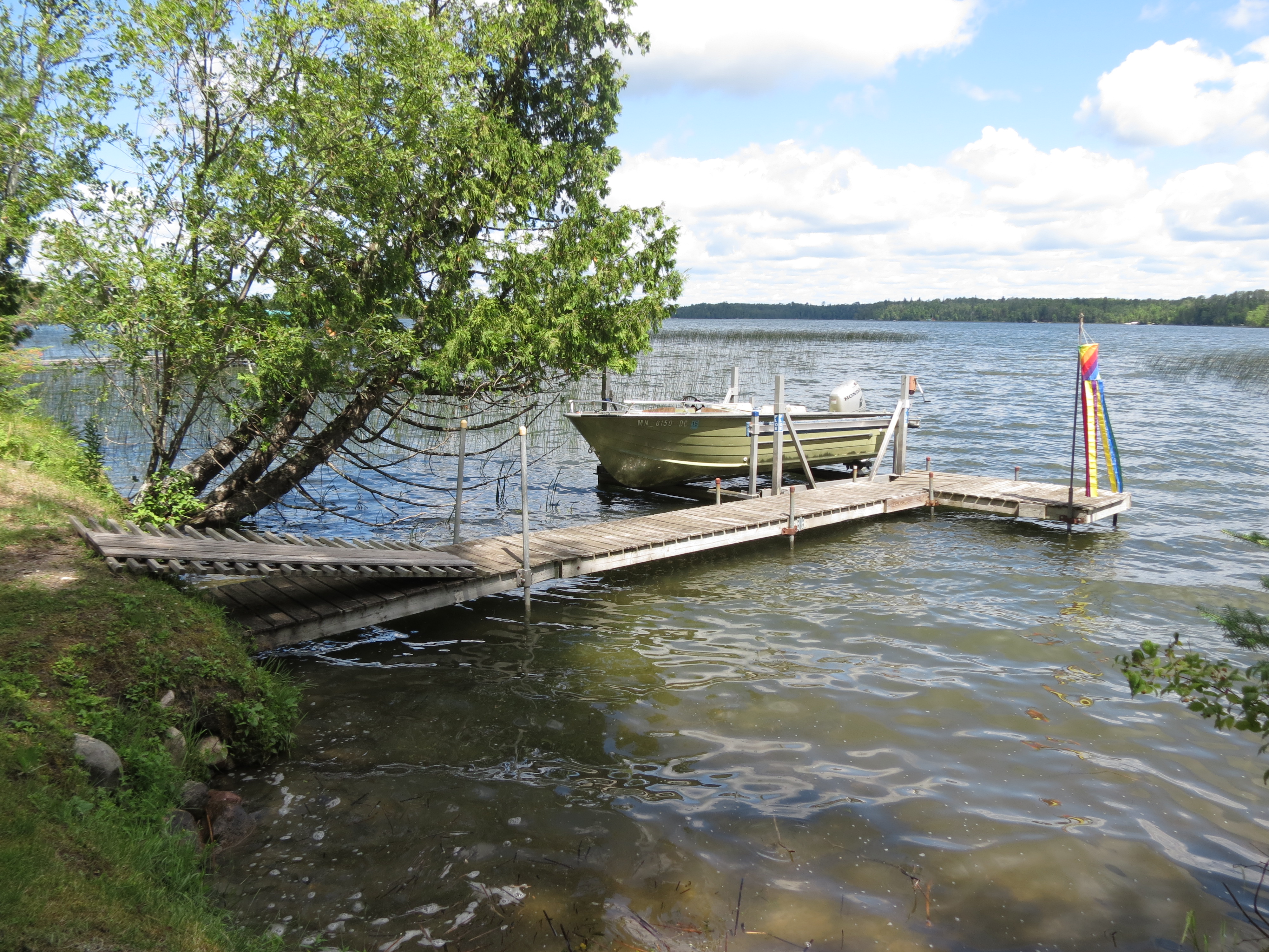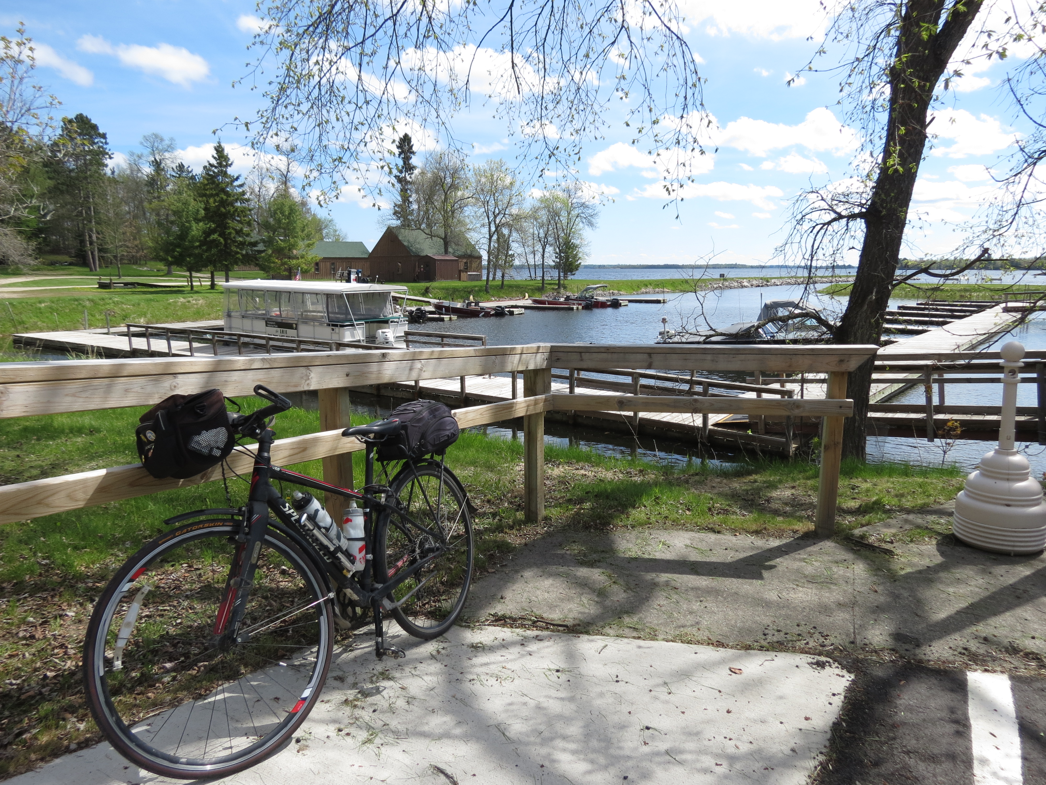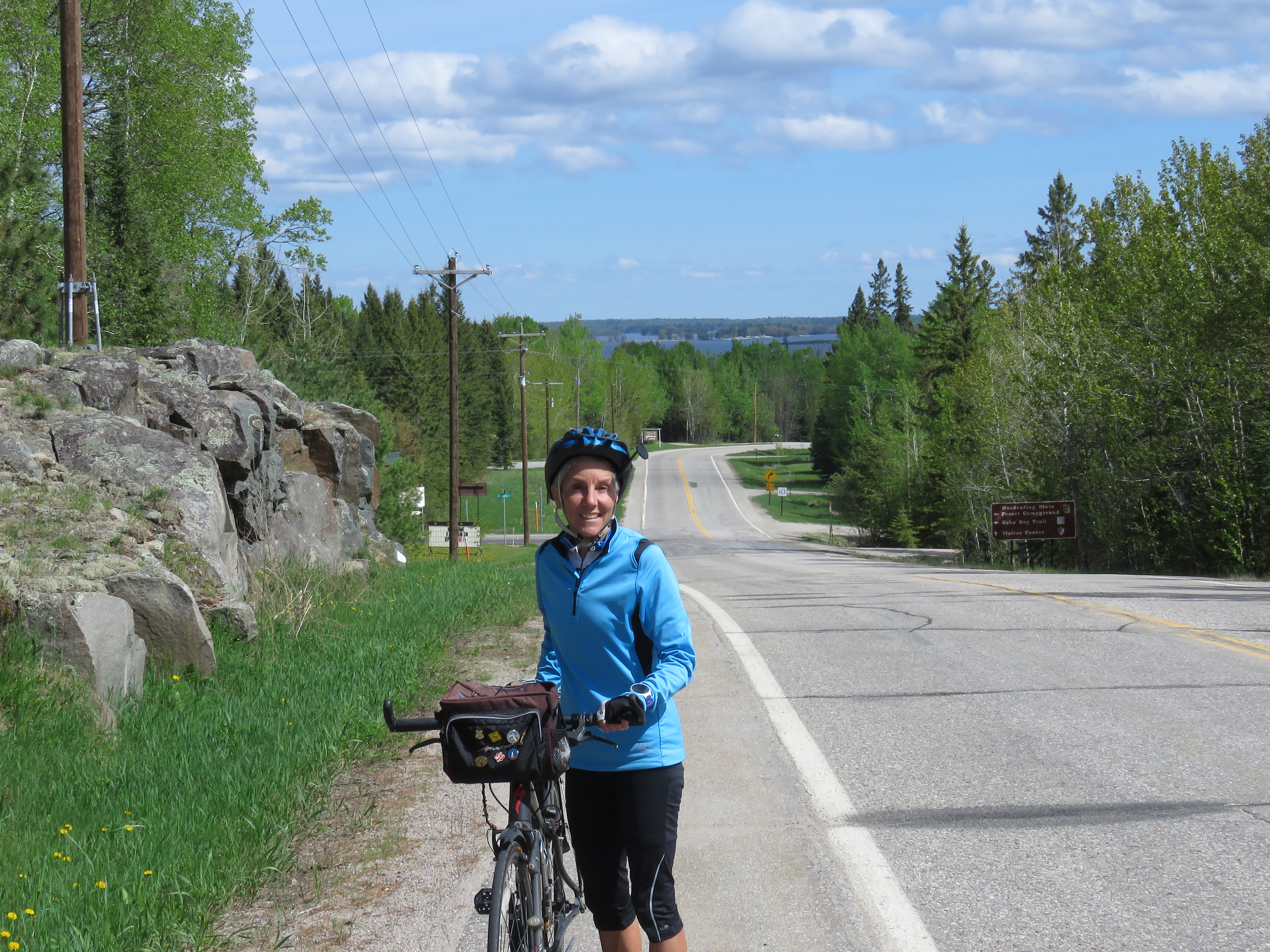 The next day took us far north. Driving to Littlefork we cycled from there to Lake Kabetogama on the border. The sun shone gloriously all day and like the day before we benefited from good pavement and lack of traffic. We made our way to the Voyageurs National Park Visitor Center. Although it was not yet open for the season, it did give us access to the lake and a view of its blue expanse. This time it was breakfast that we ate at the Rocky Ledge. The area was heavily populated with resorts, and the staff was bracing for the onslaught of the holiday weekend. That morning, however, we were the sole customers.