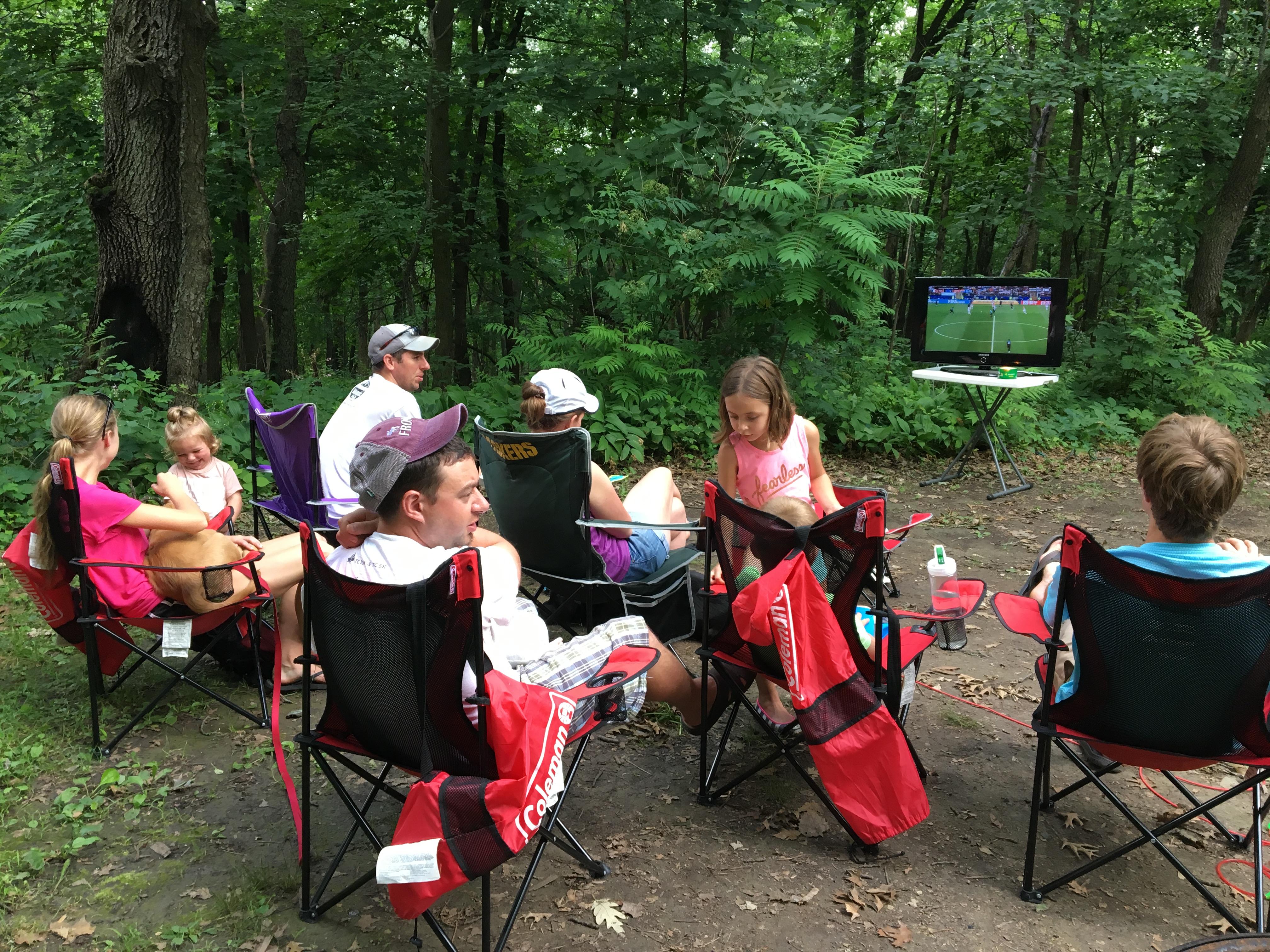 The fact that the World Cup finals were scheduled for 10am Sunday morning gave little pause for concern to the sports enthusiasts in the family. At the appointed hour, those lawn chairs made their final pilgrimage to Carl and Chelsea’s tent site. A flat screen TV running off the car battery grabbed the local broadcast signal and game snacks graced the picnic table. Game on! Although I chose an alternate activity, walking the dogs with the moms and kids, I had to admire the ingenuity.