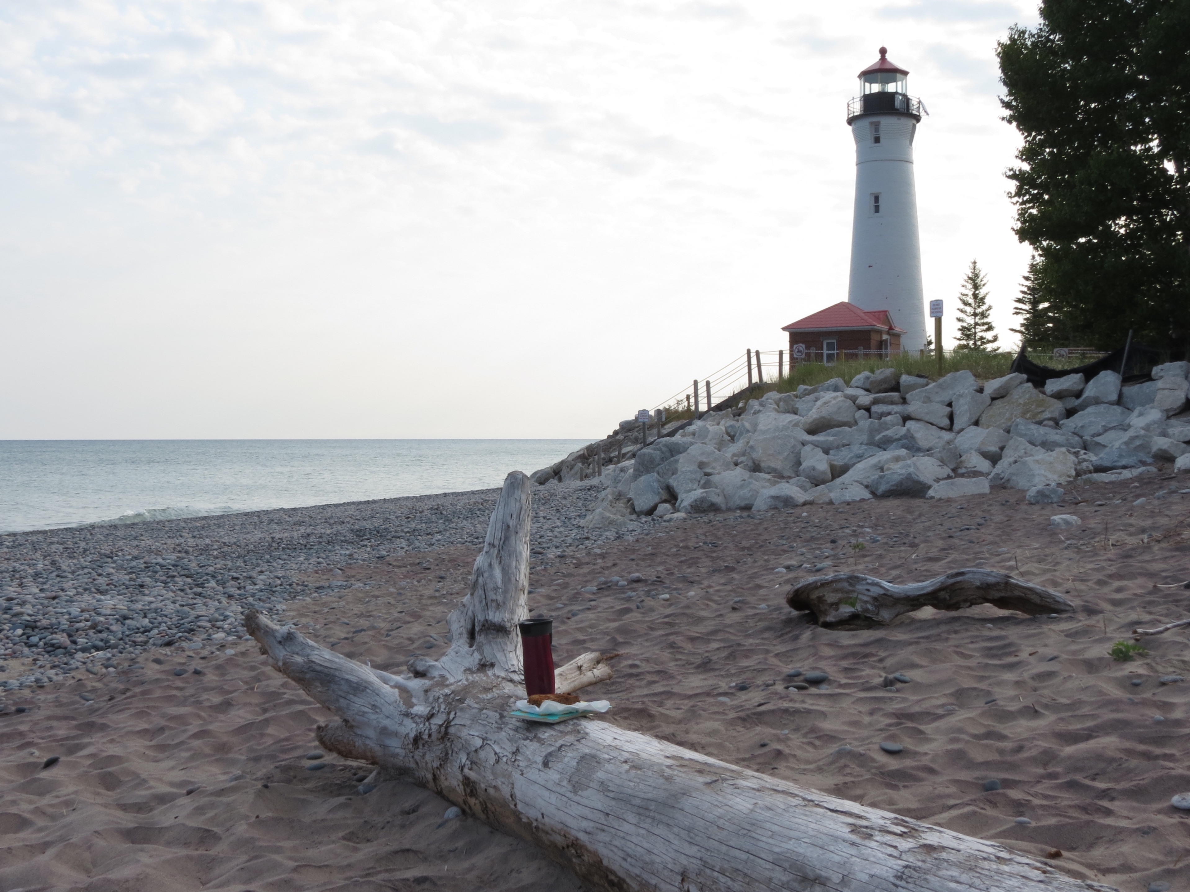 Mornings are my favorite, and I make an effort to be up in time to watch the sunrise unfold. It rarely fails to impress, and never looks the same twice. The site is quiet at that time of day, as are the miles of sand beach that stretch on either side of the lighthouse. Following sunrise I start my day with a brisk walk down the beach, which also changes from day to day. The lighthouse shrinks and recedes into the distance as I walk, then gradually grows again on my way back. We were surprised this year to discover that we could walk all the way around the lighthouse – never before since we started keeping in 2015 has there been beach between the tower and the water. I hadn’t realized Lake Superior’s water level was so low this year.