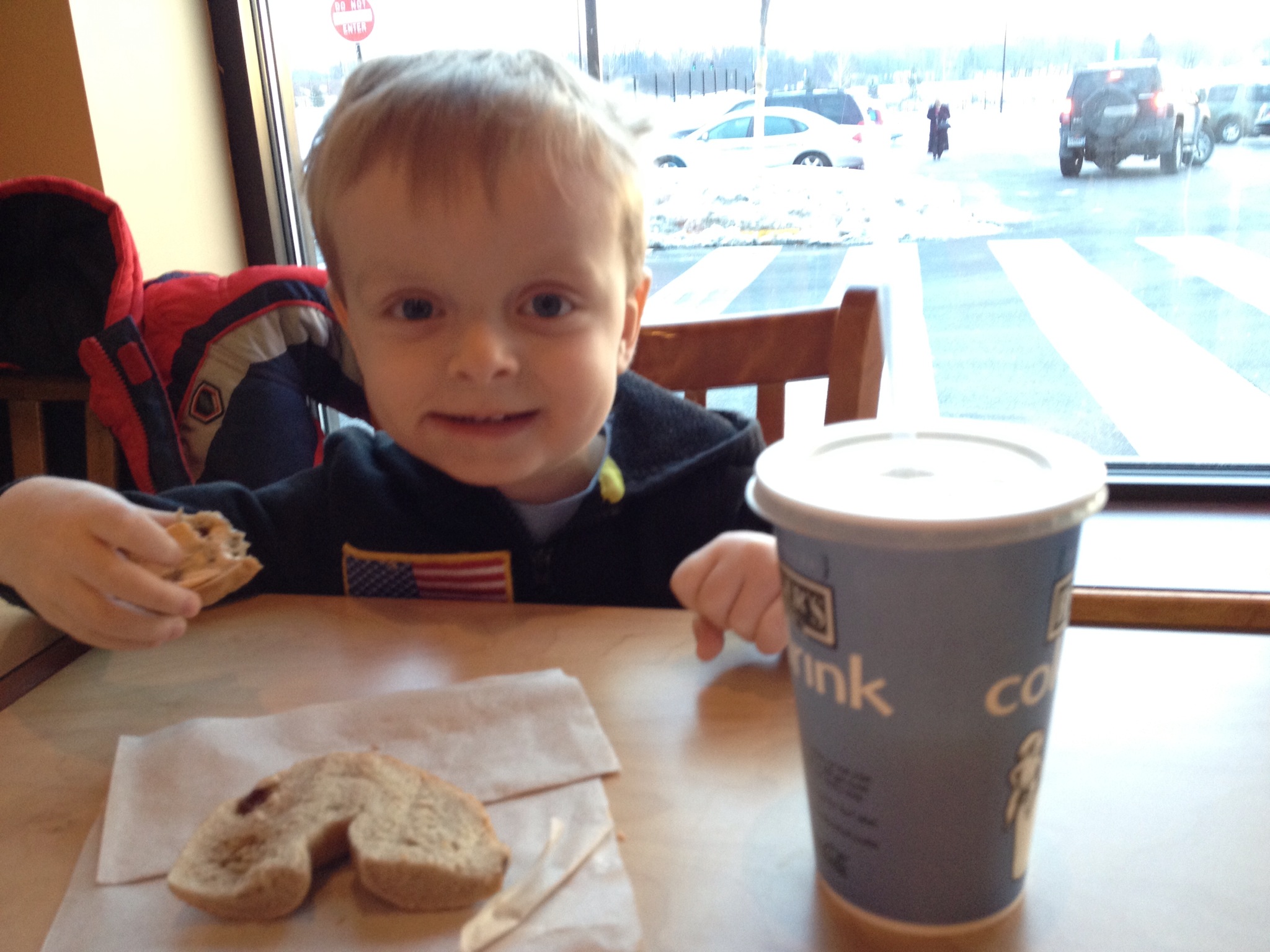 And on to the new generation.  My grandson, Ben, is old enough for bagels now, so when we spend days together while his mom and dad are at work, guess where we head first?  He too loves his Brueggers Mornings.photo 1