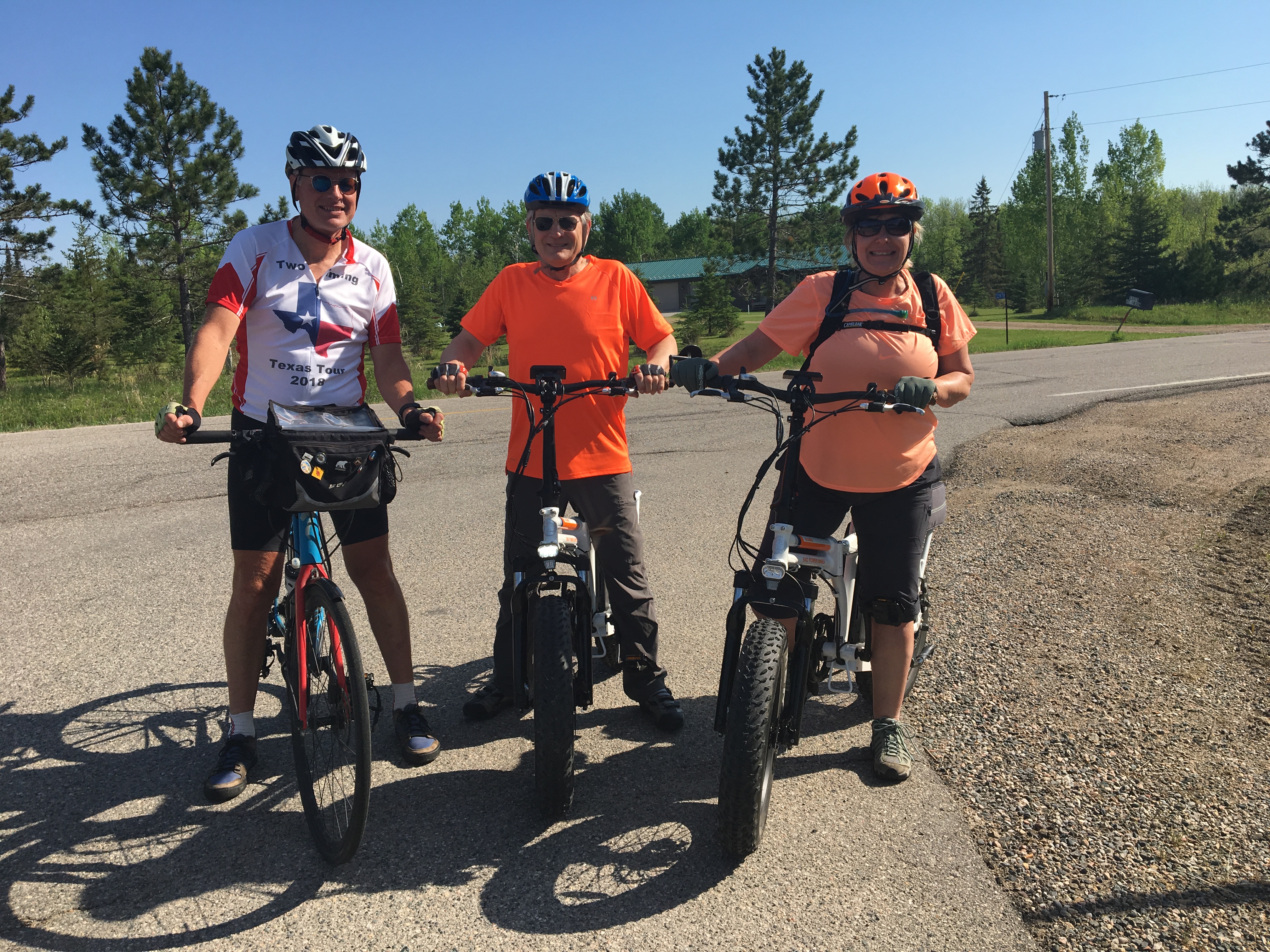 Up before dawn, we were treated to a beautiful red sunrise reflecting in the calm waters of the lake. It was still shady and cool when we started our ride, with high hopes that the early hour would yield some wildlife sightings (me) or birds (Rich). We saw neither but were privy to the woods awakening, streams calmly wandering and copious bird chatter. A rendezvous with friends at the Effie Cafe for breakfast allowed us to catch up, share some camaraderie, and to investigate their new e-bikes.