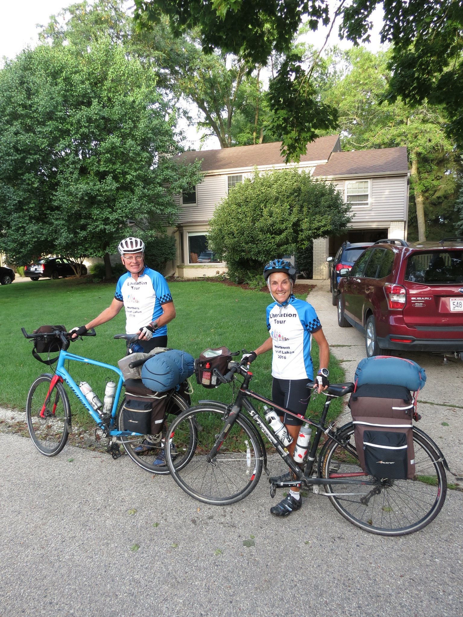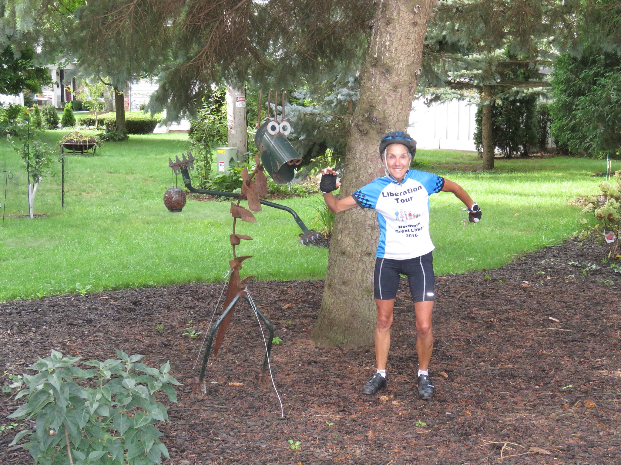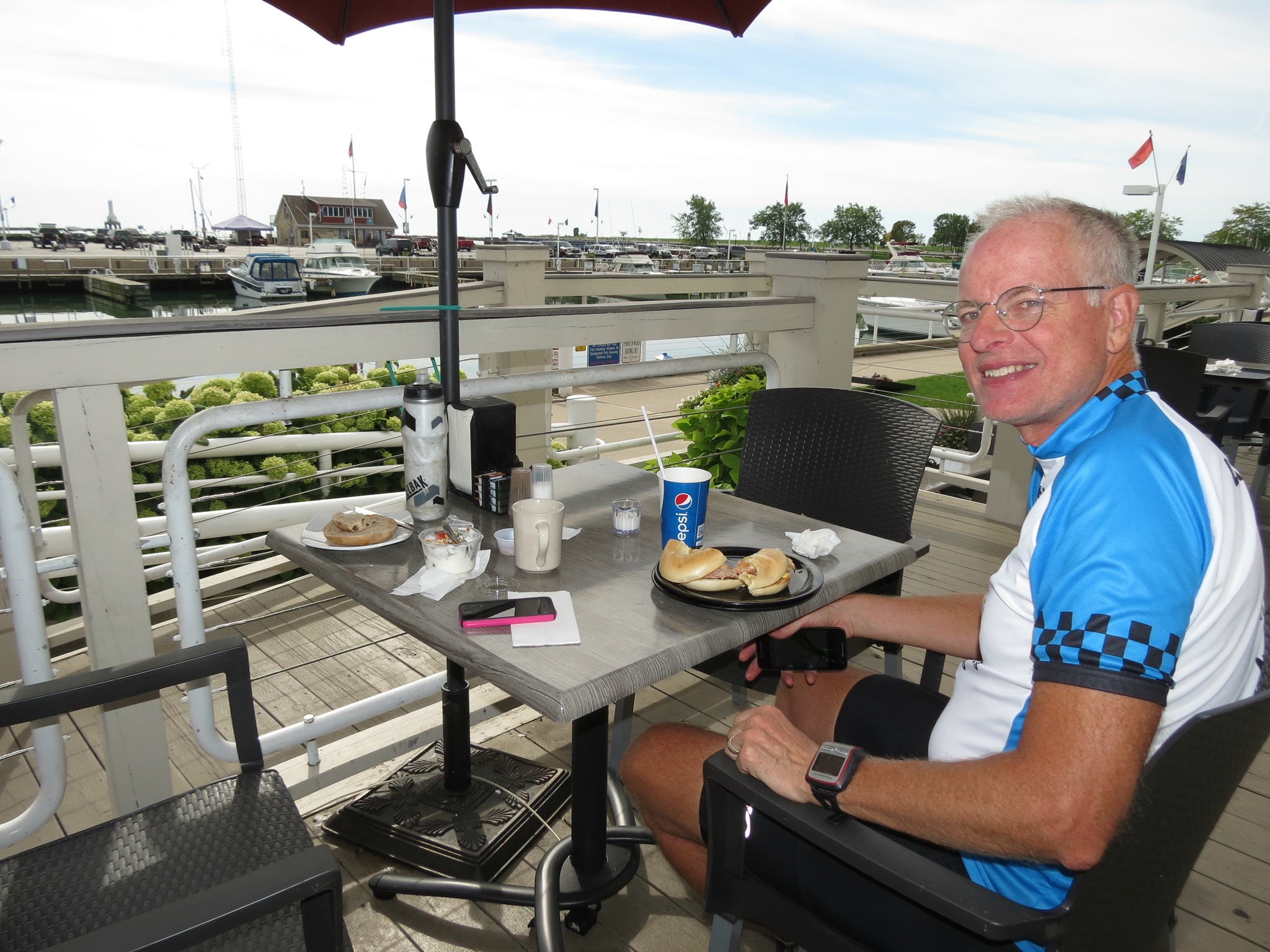 Our next foray was in heavy drizzle and got us almost 2 miles. Art's Tavern was our breakfast stop, and we even saw a few short bursts of almost-sunshine during our repast. By the time we emerged, we felt confident that the day was improving. At the time, it was true. And weather was not our next showstopper, but a flat tire. Still only 8 miles into our journey, we were sidelined once more as Rich changed his inner tube. Relieved to be on a bike trail not the road, we rejoiced in our good fortune along with staying dry – for the moment.