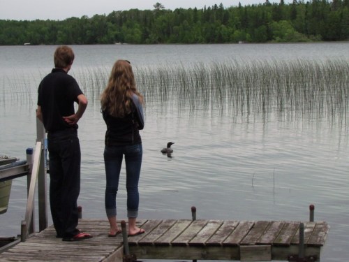 Knowing how skittish they are, I set up my camera and monopod on the deck of the cabin. I was afraid that getting any closer was likely to drive him away. But after snapping a multitude of photos, I ventured halfway down to the lake, and eventually right onto the dock. Still Mr. Loon lingered. Swimming slowly back and forth, he seemed to accept our presence, even when Katie and Erik joined me. He wasn't fazed by us in the slightest.