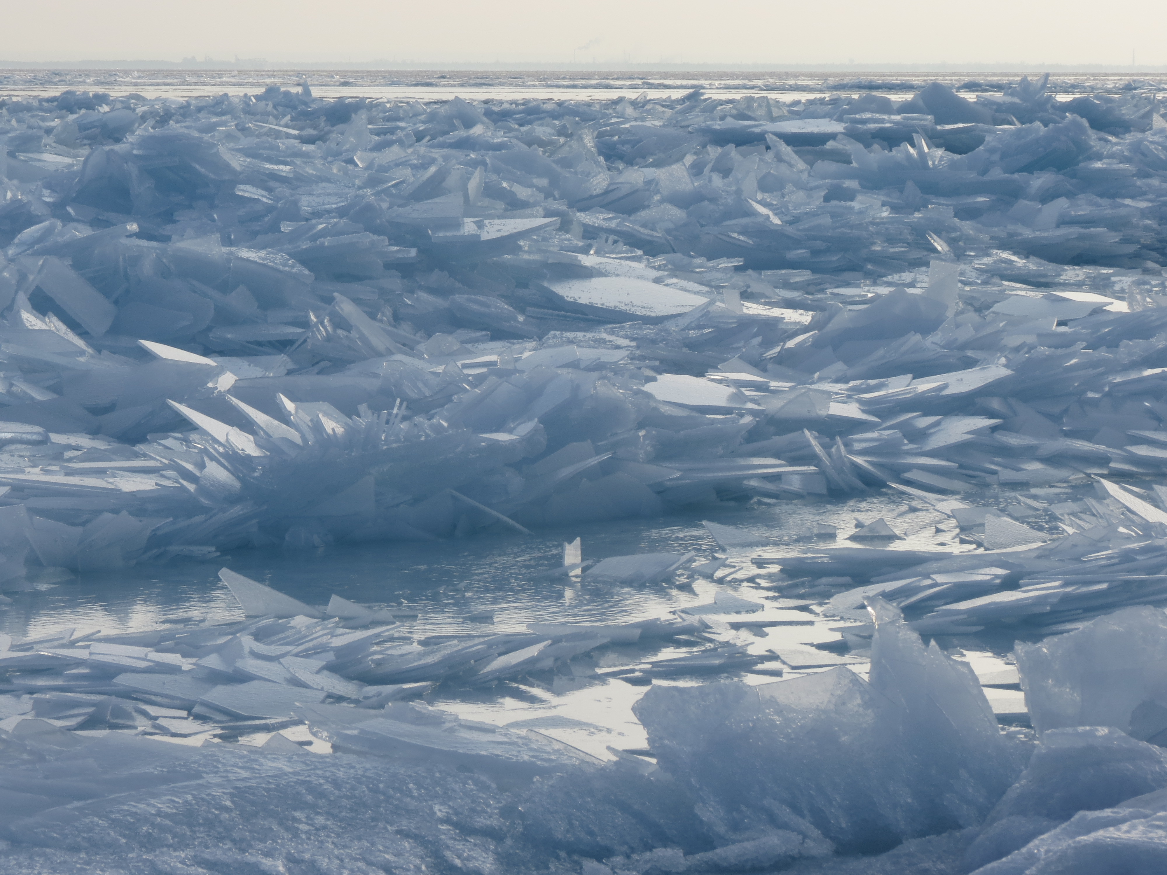 proceeded to cross over the bay on the bridge. The bridge was wonderfully bicycle-friendly, with a dedicated bike lane that was well protected from traffic. As luck would have it, we also had a scenic view of the St. Louis River basin on our side of the bridge. With the rising sun behind us and calm waters in the bay, we had lovely views of the railway bridge and surrounding waterway.
