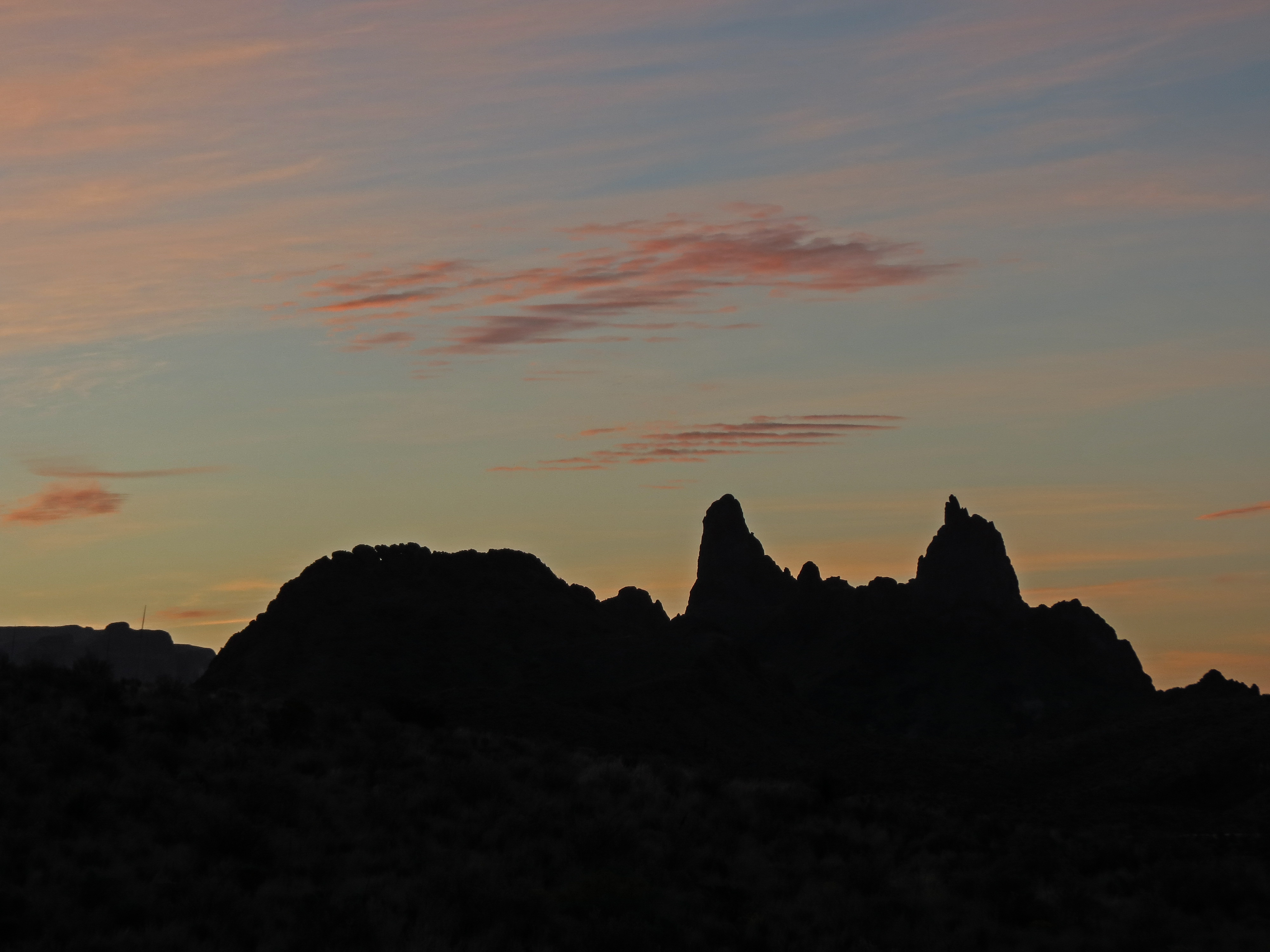 We left our little cabin well before dawn in order to watch the sunrise in the park. We didn’t count on a rough dirt road to reach our chosen scenic location, and decided to detour on the paved but still-slow road. The Mule Ears rock formation materialized in time to stop for the sun’s arrival. Finally having light to see our environs, we took in the bluebonnets blooming on the roadside – uniquely tall and stringy, compared to their short, dense Hill Country cousins.
