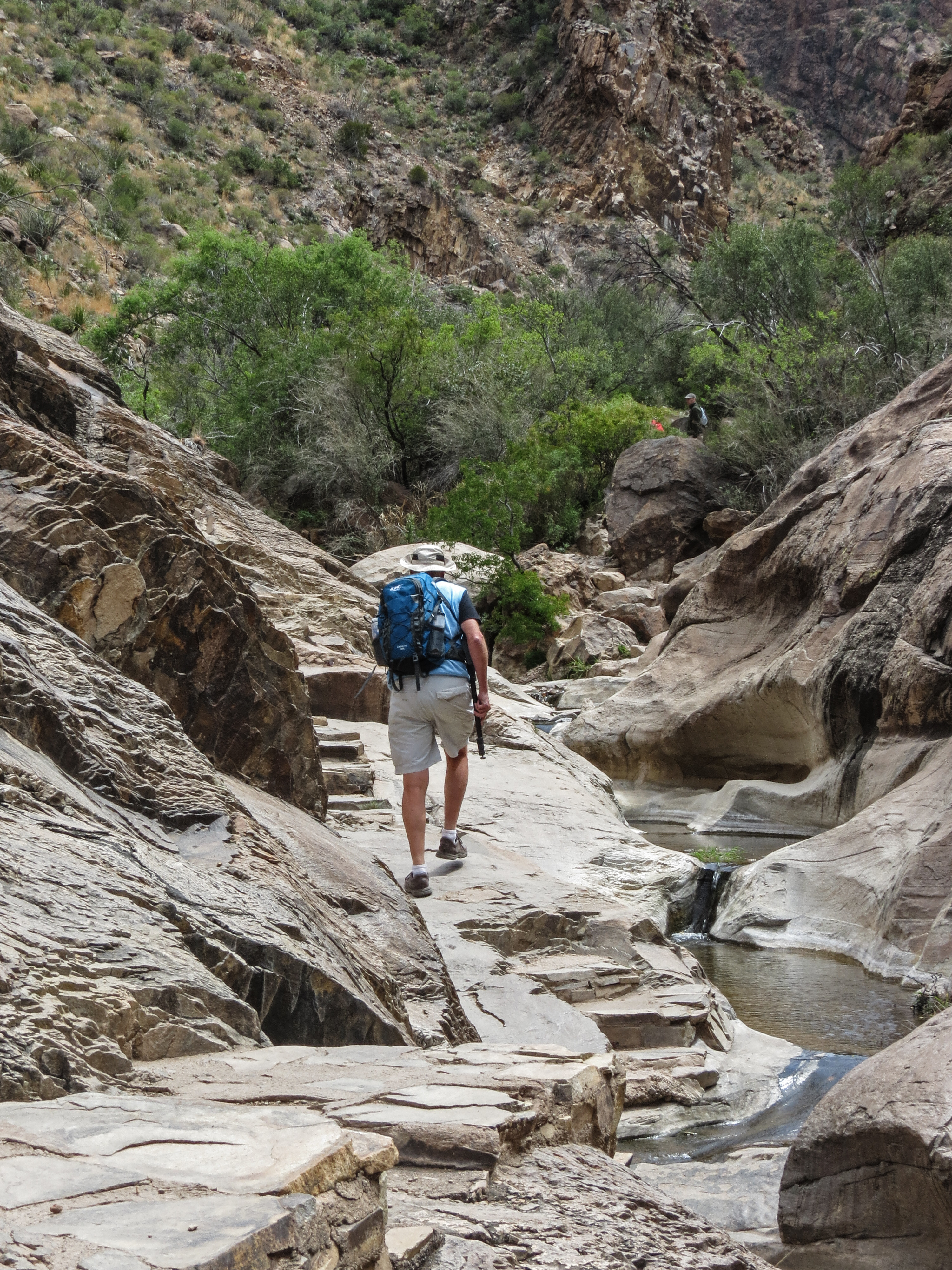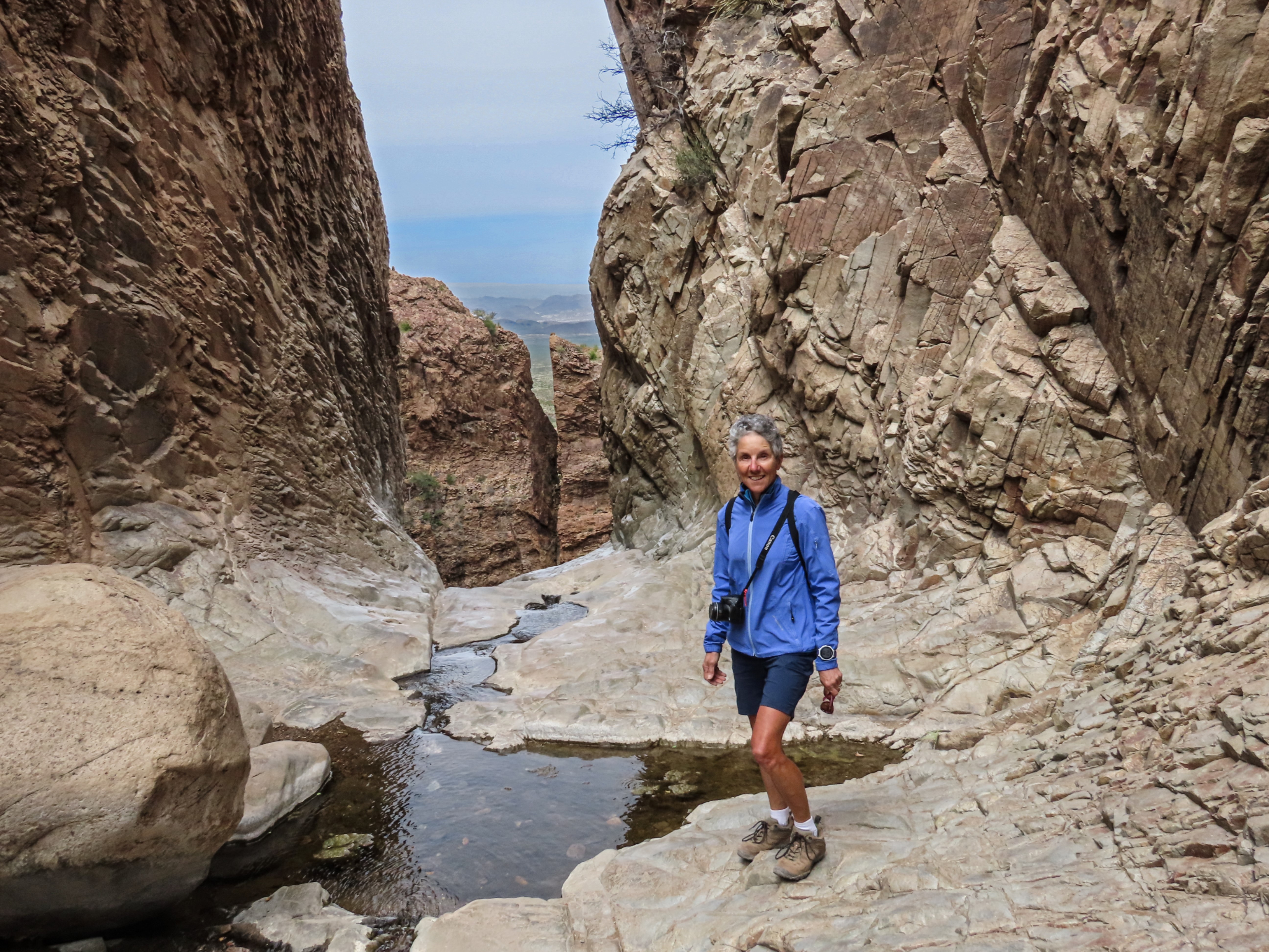 Our second hike of the day was in the Chisos Mountain area in the center of the park. A three-mile walk through scrubby desert environs took us gradually down into the valley. We were at the beginning of the desert bloom, with plentiful wildflowers of all colors and cactus flowers just popping out. The easy path ended with clambering over boulders and hopping across slightly flowing mountain streams. But the end view was worth it – The Window provided an opening with a straight drop below and a narrow crevice beyond. A fierce wind whipped through that window, and I kept well away from the opening.
